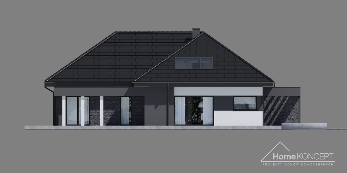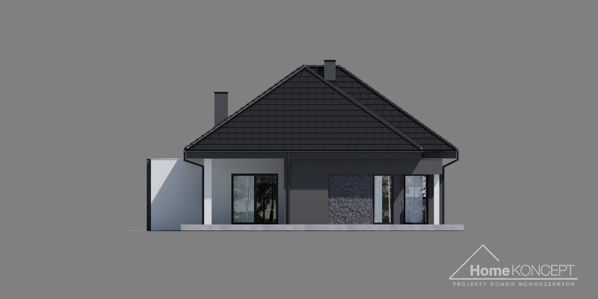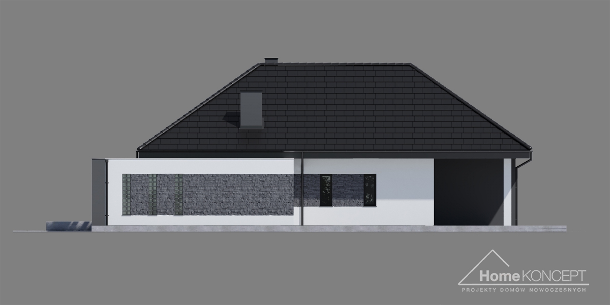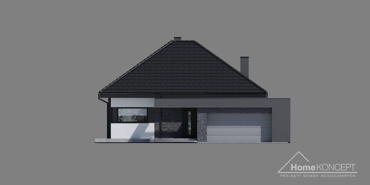 HomeKONCEPT 55 to nowoczesny dom parterowy, dedykowany na wąskie i długie działki. Budynek zachwyca swoją elewacją, jest to piękne połączenie białego i grafitowego tynku elewacyjnego z kamieniem naturalnym. Od frontu i od strony ogrodu, budynek okala, tak charakterystyczne dla pracowni – belkowanie.