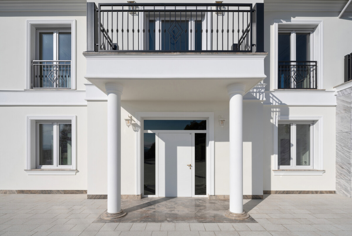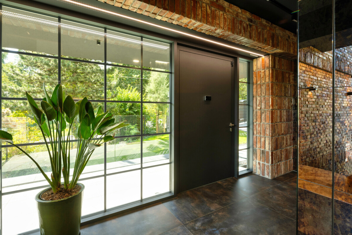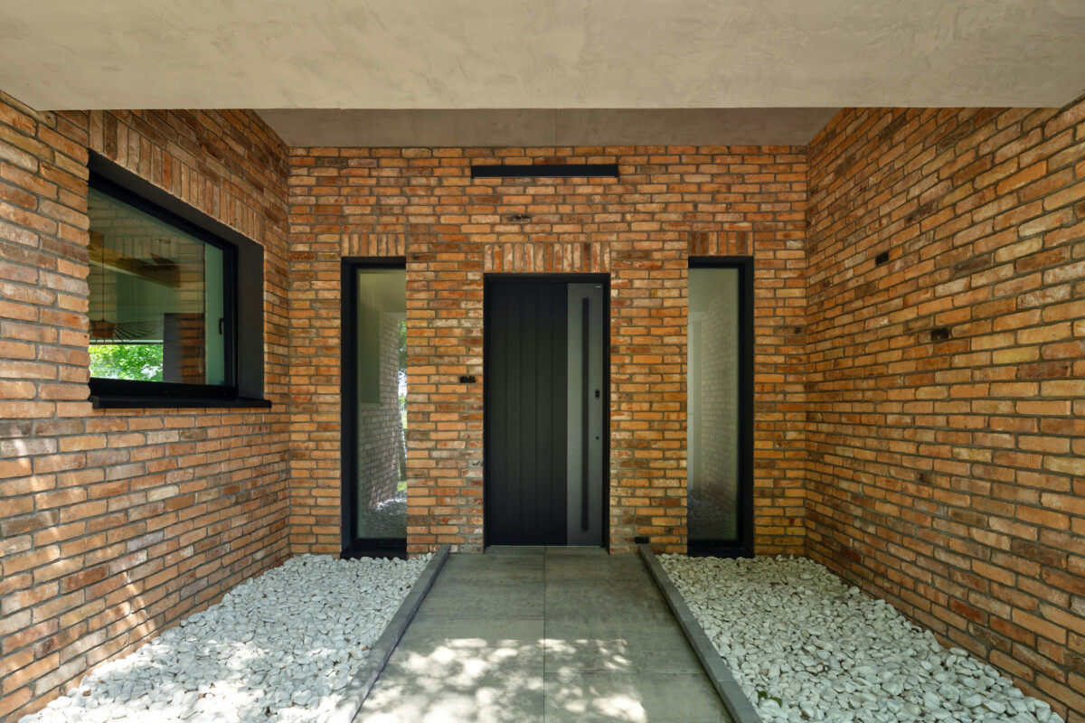 Klasyczna architektura wymaga bardziej stonowanych rozwiązań. Tu warto sięgnąć po subtelne doświetla boczne z mlecznym szkłem, które zapewniają prywatność, nie zakłócając przy tym harmonii fasady. Takie przeszklenia dodają lekkości, nie dominując wizualnie.