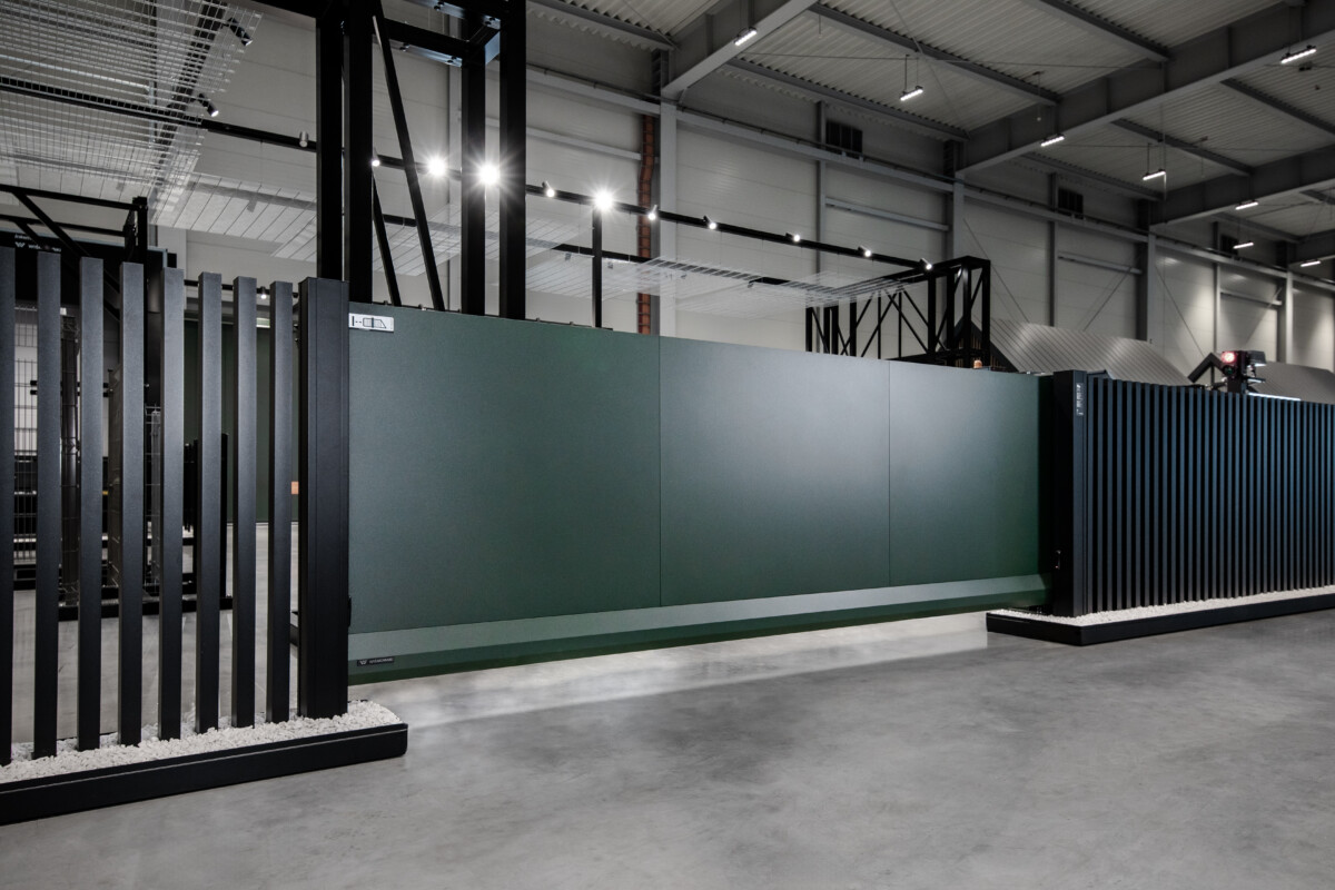 Zestawienie kolorów HI Deep Green i HI Cosmic Black umożliwia naturalne rozróżnienie stref funkcjonalnych – reprezentacyjnego wjazdu oraz lżejszych wizualnie odcinków palisadowych – przy zachowaniu spójnej, konsekwentnej stylistyki. To połączenie szczególnie dobrze współgra z elewacjami w jasnych tynkach, betonie architektonicznym i odcieniach szarości, a także z drewnianymi detalami.