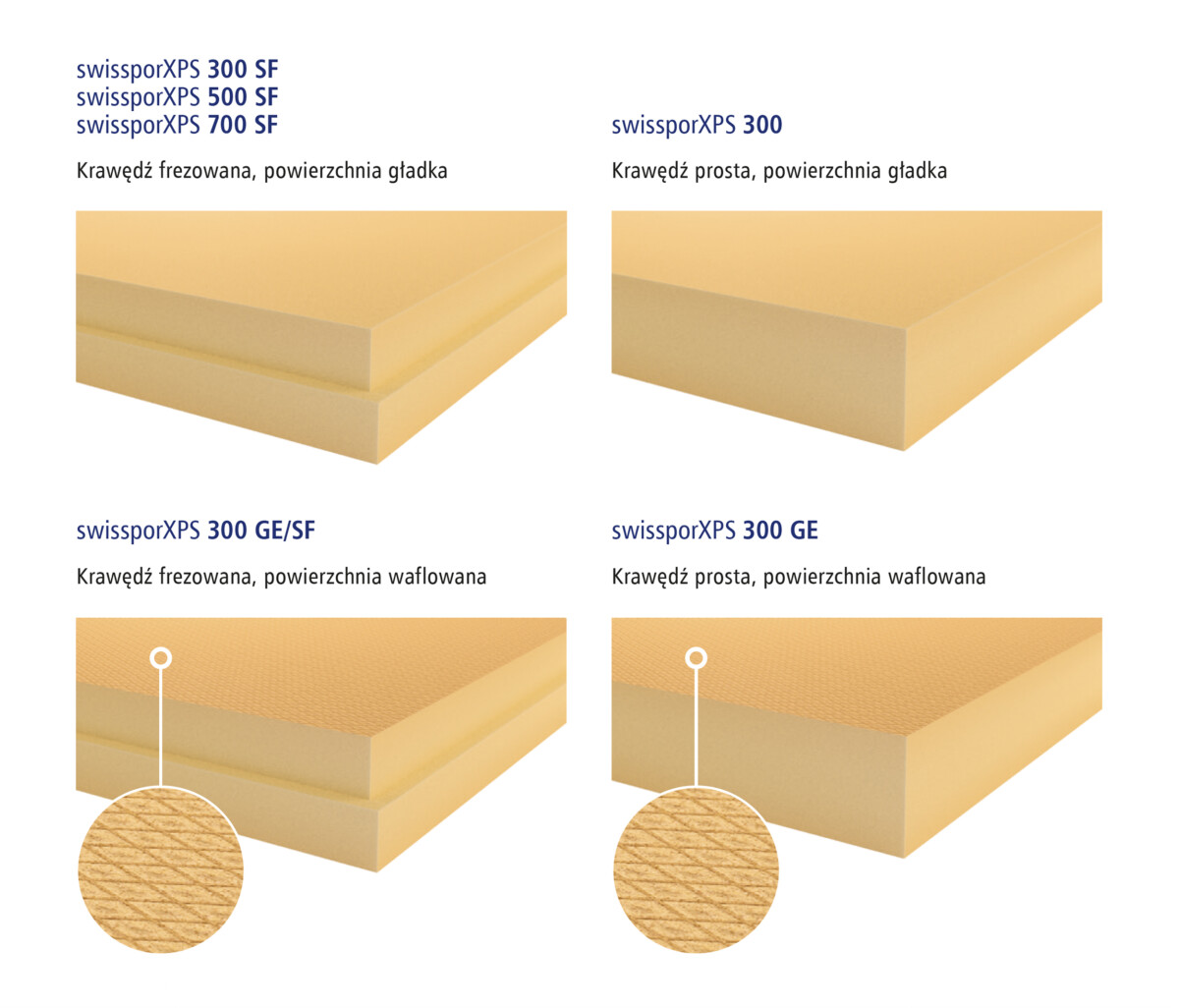 swissporXPS dostępny jest w dwóch wariantach powierzchni, z których każdy przeznaczony jest do innych zastosowań. Oba posiadają płyty o krawędziach prostych lub frezowanych. Zrozumienie różnic pomiędzy płytami swissporXPS z powierzchnią gładką i waflowaną jest kluczowe dla prawidłowego wykonania izolacji.