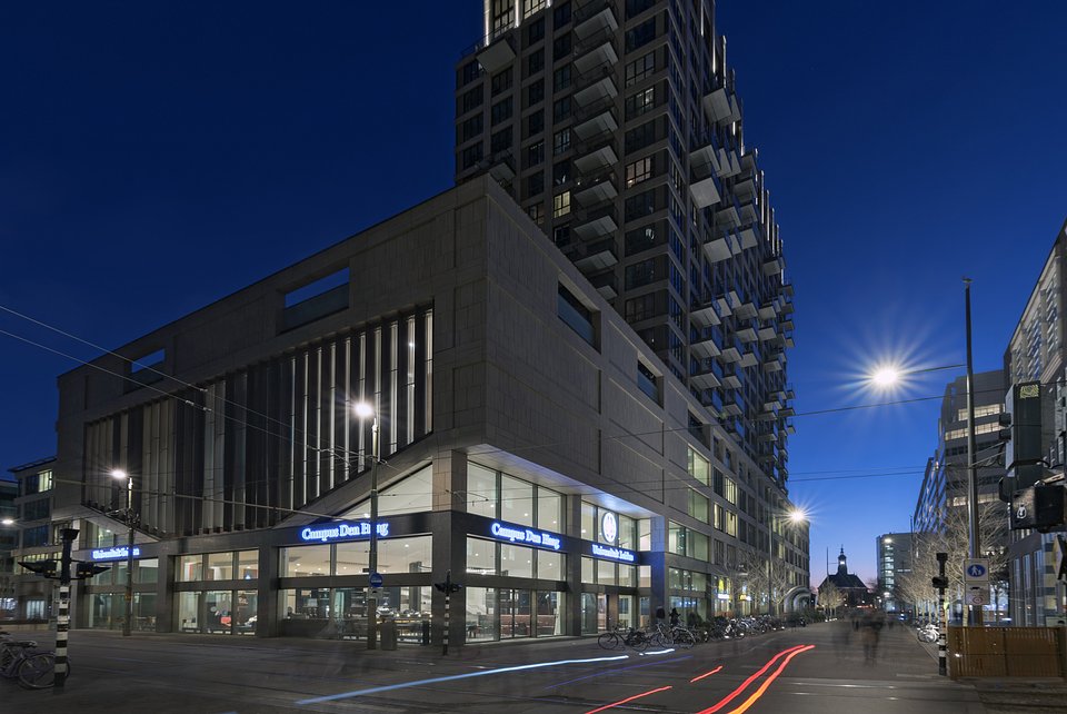 Nośna konstrukcja betonowa byłego wieżowca to wszystko, co pozostało z dawnego kompleksu biurowego dwóch ministerstw z lat siedemdziesiątych, który został zintegrowany z nowym Wijnhavenkwartier. Wentylowana fasada o powierzchni 12 500 m² jest prawdziwą gratką dla fanów architektury. Została pokryta barwionymi na zamówienie płytami ceramicznymi Royal Mosa, które zostały wykonane i wyprodukowane na potrzeby tego projektu. Możliwość specjalnie projektowanej i unikalnej okładziny ceramicznej jest jednym z punktów wyjątkowej oferty Mosa. Fasada budynku stanowi wizualne odniesienie do podłoża piaskowego, na którym wzniesiono Wijnhavenkwartier: obok pobliskiej plaży i centrum Hagi, zwanej „miastem za wydmami”.