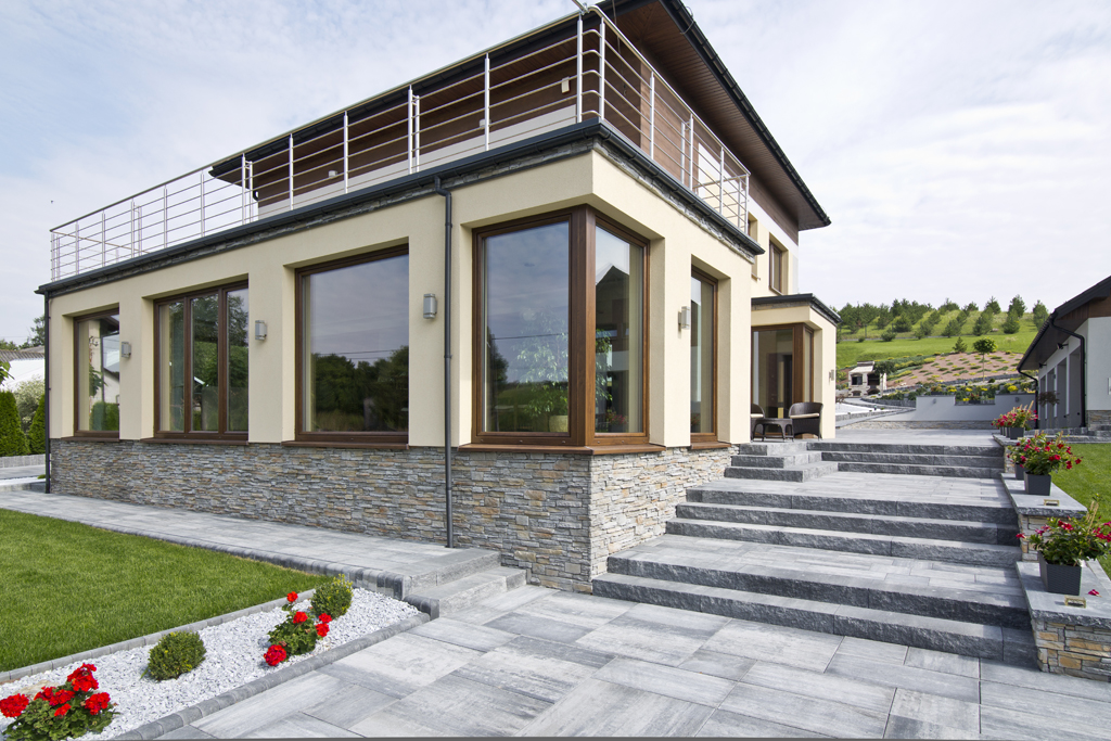 Chcąc zaaranżować spójne stylistycznie otoczenie domu, dobrze jest użyć tych samych materiałów i od strony frontowej domu, i w ogrodzie. Wygodnie jest korzystać z serii produktów komplementarnych – na przykład firma Bruk-Bet oferuje betonowe płyty brukowe z linii Novator, płyty tarasowe Architect, stopnie schodowe oraz palisady w jednakowych wykończeniach kolorystycznych metalic color lub color-mix.