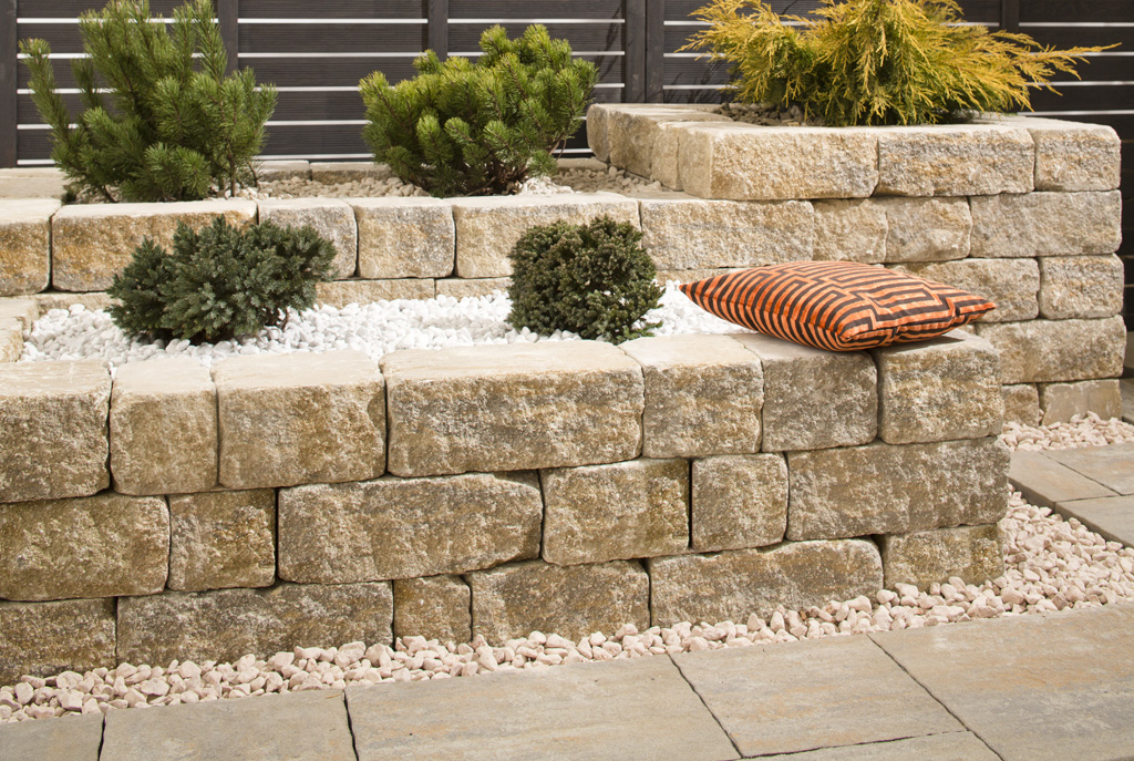 Na zróżnicowanym terenie planowane są skarpy i schody, przy których mogą być potrzebne murki oporowe wzmacniające krawędzie. Można je zrobić z gotowych bloczków betonowych, na przykład Gardenit z oferty firmy Bruk-Bet. Wyglądem przypominają kamień, a ich zróżnicowane kształty pozwalają łatwo i szybko wznosić murki.