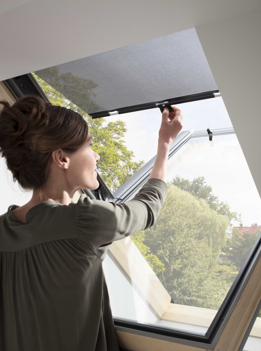 Zewnętrzne markizy VELUX zatrzymują promienie słoneczne jeszcze zanim dotrą one do szyby okiennej, dzięki czemu redukują nagrzewanie się wnętrza. Są one wykonane z tkaniny w formie siateczki, dzięki czemu nie zasłaniają tego, co jest za oknem i nie zaciemniają wnętrz. Materiał, z którego wykonano markizę jest trwały i łatwy w czyszczeniu, dzięki czemu można korzystać z niej przez wiele lat. Zimą, kiedy nie potrzebujemy osłony przeciwsłonecznej, zwinięta markiza w kasetonie pozostaje całkowicie niewidoczna. Możesz zdecydować się na markizę obsługiwaną manualnie lub za pomocą klawiatury naściennej – zasilaną solarnie lub elektrycznie. Markizy solarne i manualne nie wymagają żadnego okablowania i są gotowe do użycia natychmiast po zainstalowaniu. Po opuszczeniu markizy, okno dachowe funkcjonuje bez ograniczeń, dzięki czemu możliwe jest wietrzenie pomieszczeń i korzystanie z naturalnej wentylacji bez potrzeby jej zwijania.