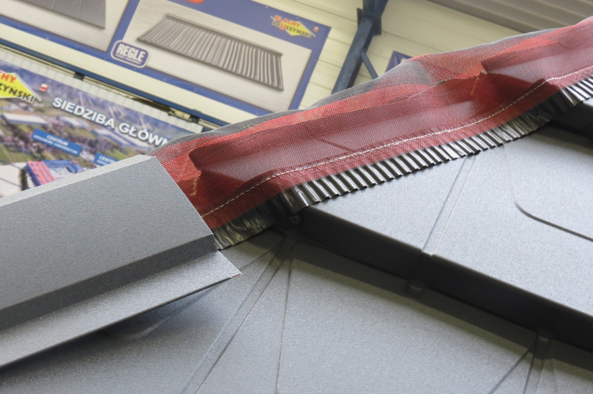 W kalenicy i w narożach montuje się taśmy wentylacyjne. Pełnią one dwie funkcje: zapewniają wentylację (dzięki perforacji lub szczotkom) i uszczelniają styk połaci. Taśmy te osłania się gąsiorami, czyli specjalnie uformowanymi elementami dopasowanymi do pokrycia dachowego.