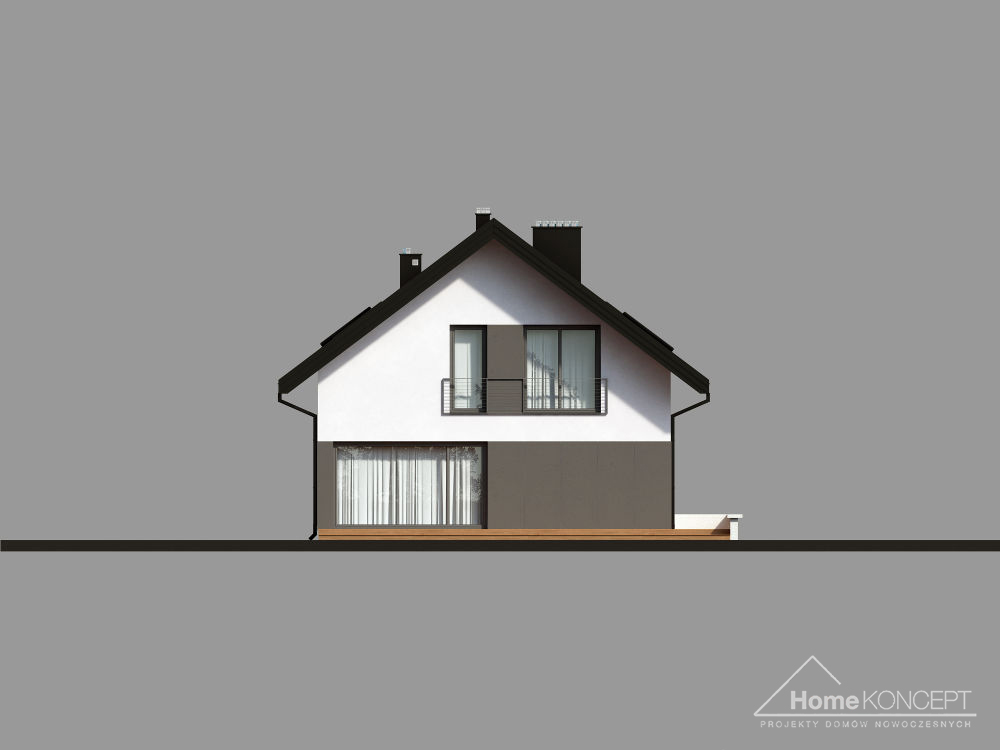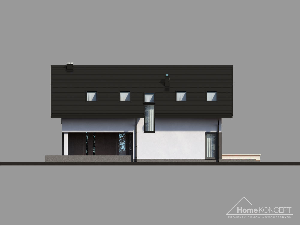 HomeKONCEPT-12 to dom, który łączy w sobie stylowy, nowoczesny wyraz z atrakcyjnym rozwiązaniem wnętrza. Dzięki prostej bryle i umiarkowanej powierzchni jest to ciekawa propozycja dla Inwestorów poszukujących projektu domu o niskich kosztach realizacji. Z zewnątrz ten dom wyróżnia oryginalna elewacja – biały tynk zestawiony z ciemnoszarymi płytami elewacyjnymi, tworzącymi na ścianach geometryczny podział. Brak balkonów, prosty dwuspadowy dach oraz duże przeszklenia sprawiają, że całość prezentuje się elegancko i harmonijnie.