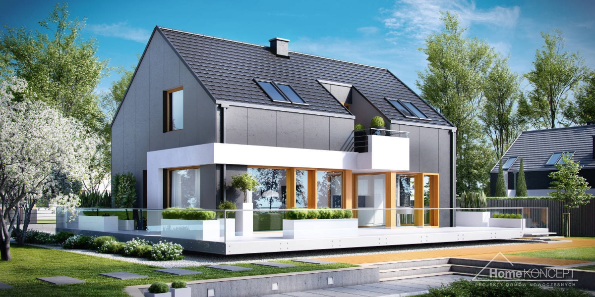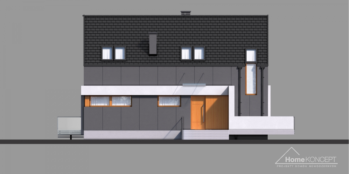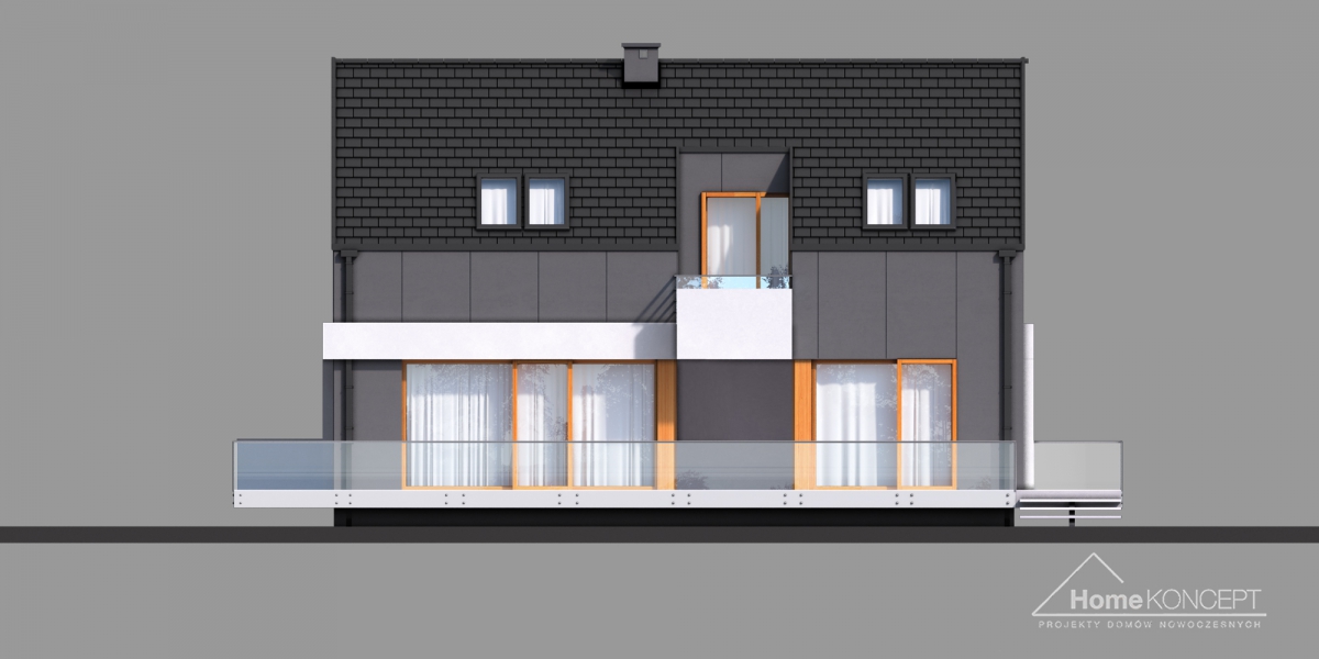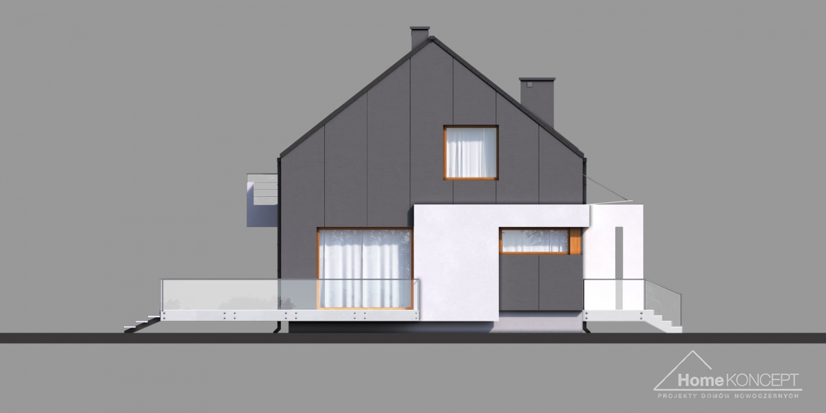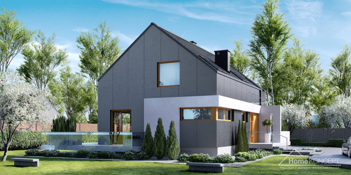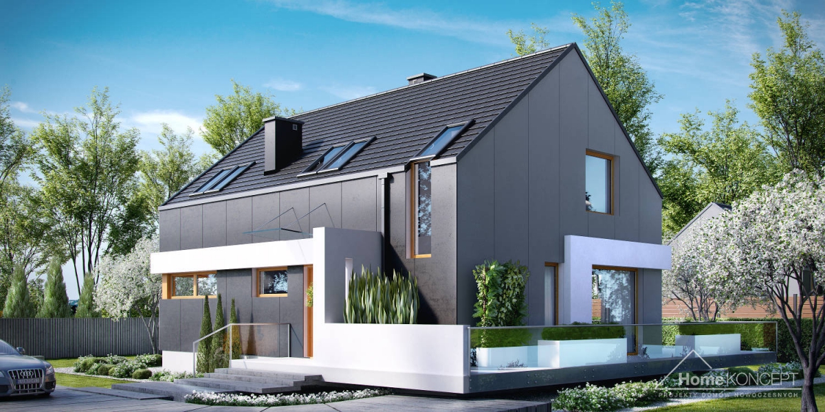 HomeKONCEPT-17 jest doskonałą propozycją dla ludzi poszukujących rozwiązań minimalistycznych i ultranowoczesnych. Wyjątkowa, geometryczna bryła z unikatowym wcięciem, rozległy taras wyniesiony nieco ponad poziom dom gruntu oraz bezokapowy dach to elementy, które z pewnością wyróżniają ten dom. Grafitowe płyty elewacyjne połączone z białym tynkiem zastosowanym na ozdobnych detalach nadają całości jedynego w swoim rodzaju, wyszukanego wyglądu.