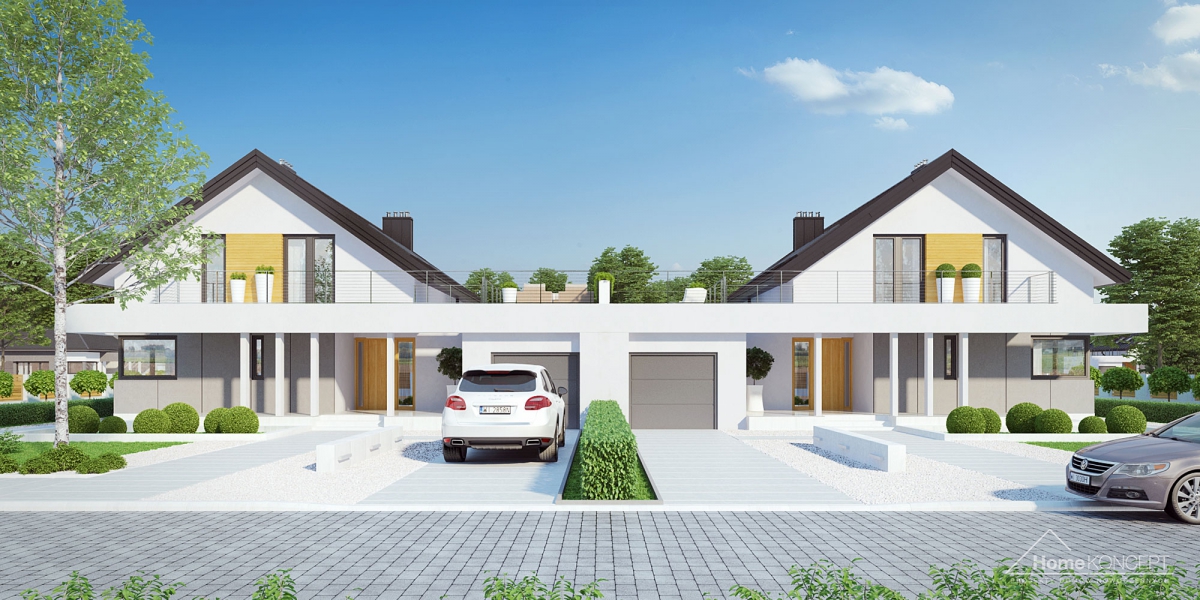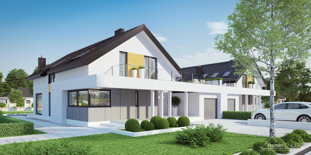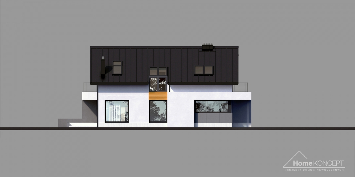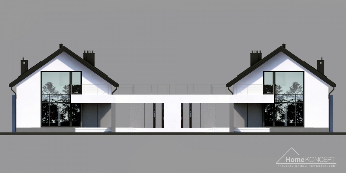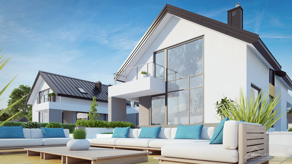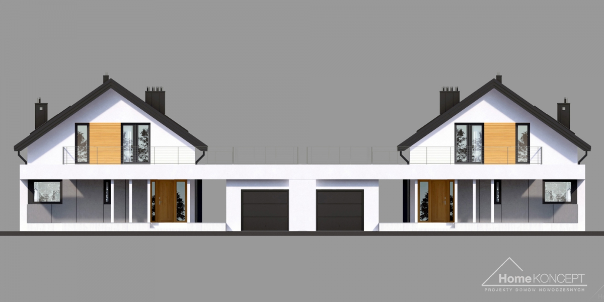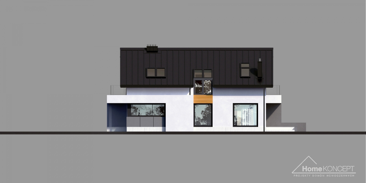 HomeKONCEPT 2 B to wersja bliźniacza kultowego projektu domu jednorodzinnego HomeKONCEPT 2. Prosta, regularna bryła zwieńczona dachem dwuspadowym została pokryta blachą na rąbek stojący i ozdobiona płytami elewacyjnymi HPL, białym tynkiem oraz elementami dekoracyjnymi z naturalnego drewna. Budynek mieszkalny połączono z garażem za pomocą podpartego filarami belkowania, które tworzy funkcjonalne zadaszenie strefy wejściowej. Taras wypoczynkowy na dachu garażu to dodatkowa strefa relaksu dla całej rodziny. Dwukondygnacyjne przeszklenie w salonie stanowi charakterystyczny element architektoniczny podnoszący atrakcyjność tego budynku i zapewniający idealne nasłonecznienie strefy dziennej domu.