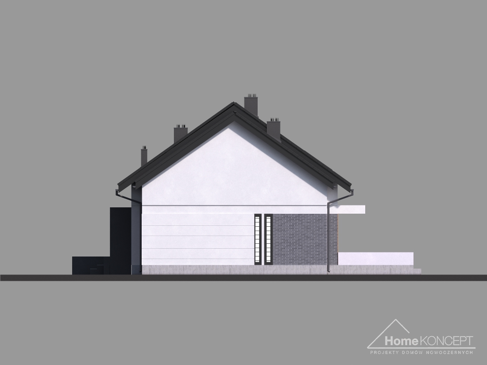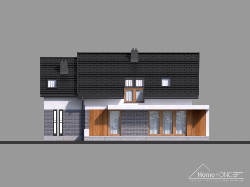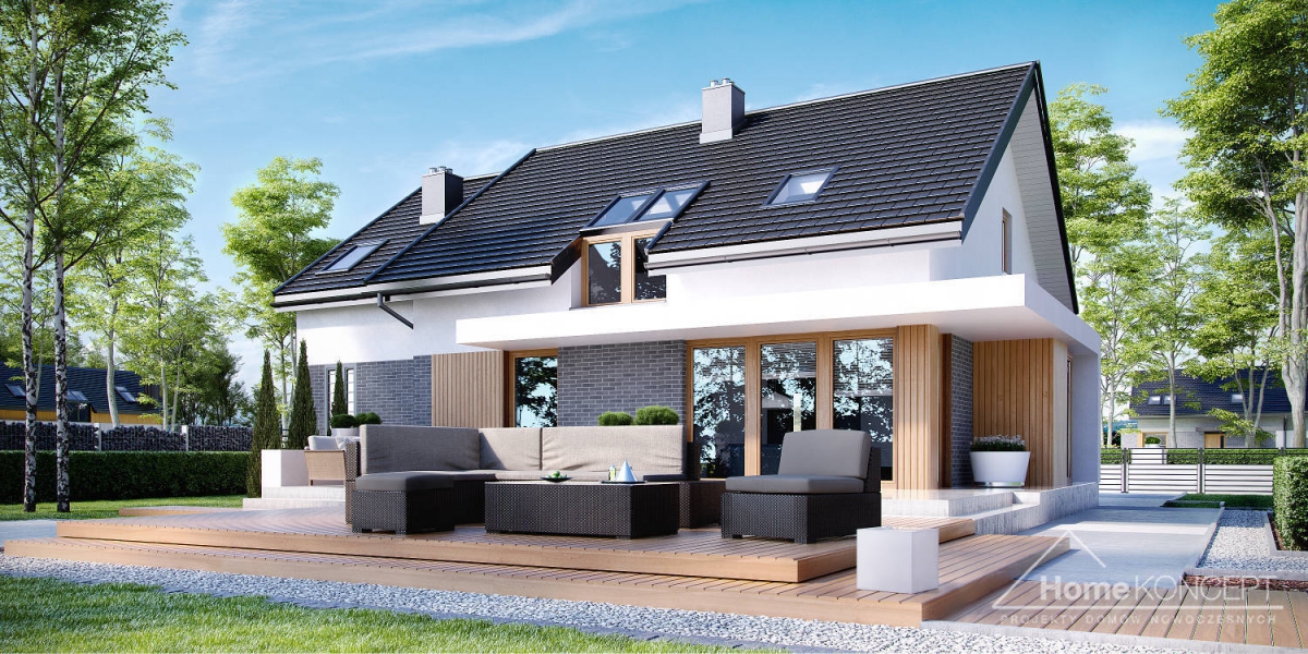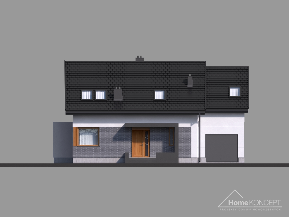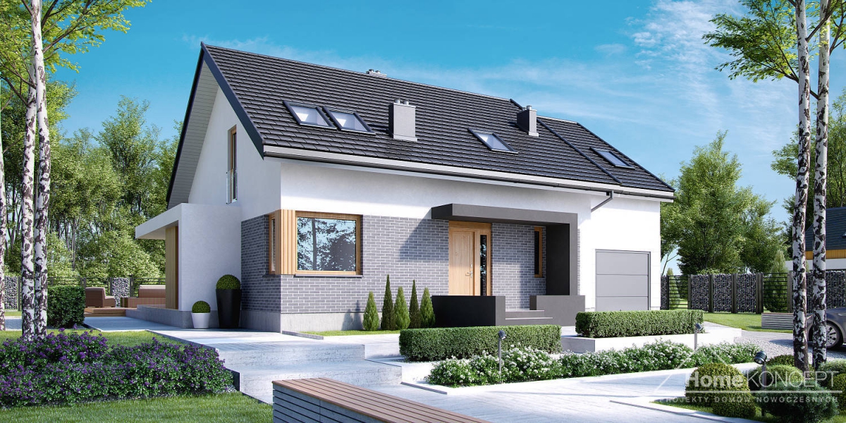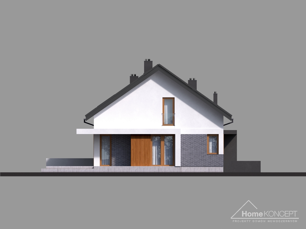 HomeKONCEPT-22 to jeden z mniejszych propozycji dostępnych w naszej ofercie projektów. Przyjemna, kompaktowa bryła domu z dwuspadowym dachem została podkreślona nowoczesnym detalem i ciekawym wykończeniem. Neutralny tynk zestawiliśmy tu z drewnem oraz płytkami imitującymi cegłę. Geometryczne zadaszenie nad wejściem w kolorze grafitu przyciąga uwagę z zewnątrz. Wnętrze ukazuje czytelny i praktyczny układ pomieszczeń. Kuchnia ze spiżarnią w zależności od preferencji może być pomieszczeniem zamkniętym bądź otwartym. Jadalnia oraz salon z kominkiem to część dzienna domu, a jej naturalnym przedłużeniem jest przyjemny taras. Na parterze znajdziemy również funkcjonalny gabinet. Duże powierzchnie przeszkleń sprawiają, że wnętrze domu jest jasne i przestronne. W części gospodarczej warto podkreślić dużą kotłownię, która daje możliwość ogrzewana domu kotłem na paliwo stałe (choć w standardzie przewidziane jest ogrzewanie gazowe).