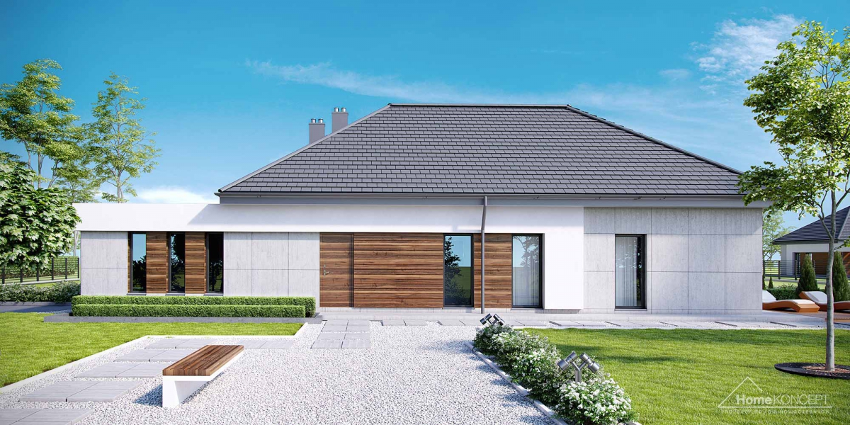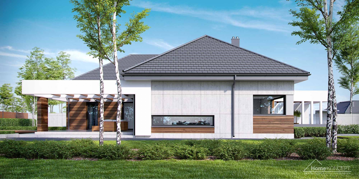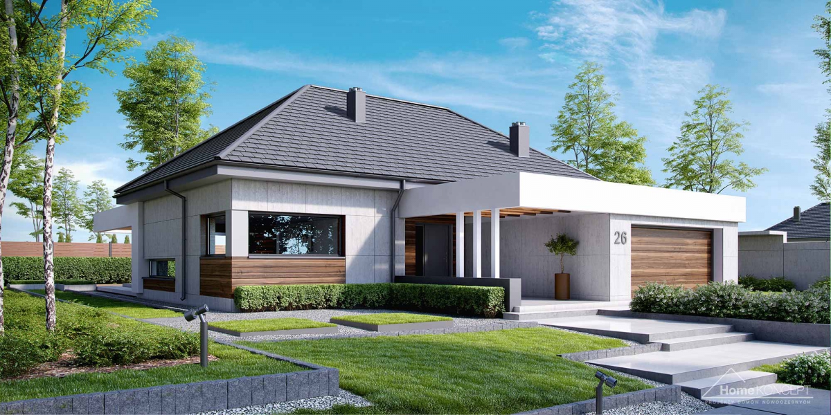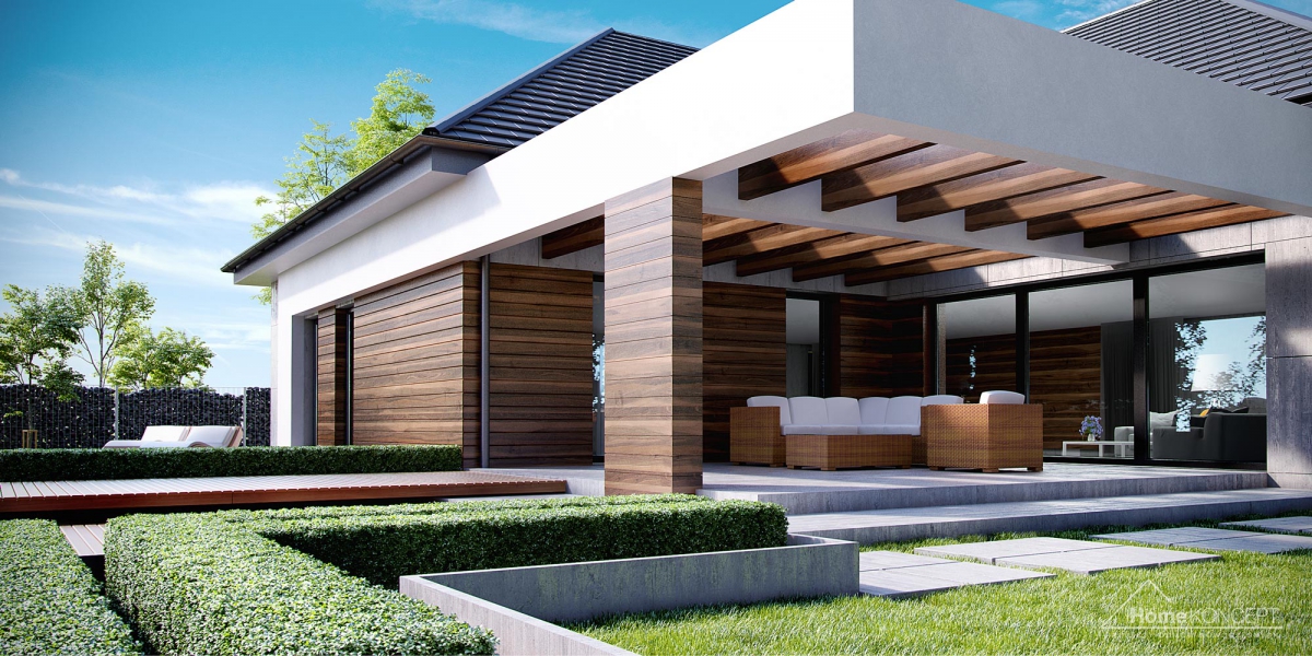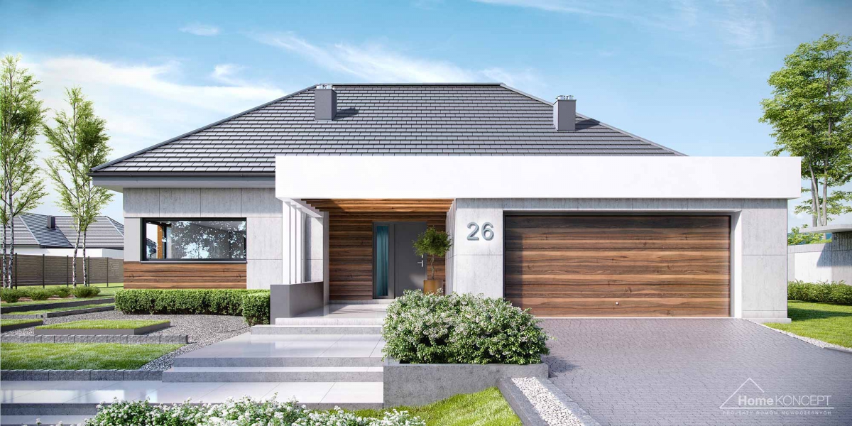 HomeKoncept 26 jest wyjątkowym domem parterowym. Uwagę przyciąga niezwykle ciekawy taras, elegancka elewacja domu wykonana z płyt betonowych połączonych z szlachetnym drewnem oraz białe belkowania wokół domu. Od frontu domu nie sposób nie zwrócić uwagi na reprezentacyjne wejście, delikatnie schowane pod drewnianym belkowaniem.