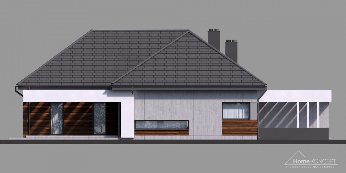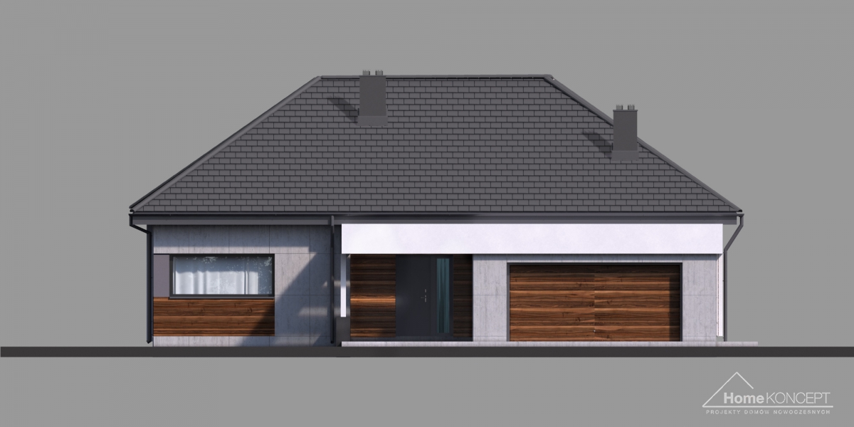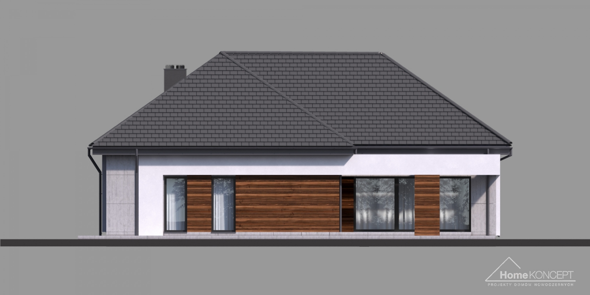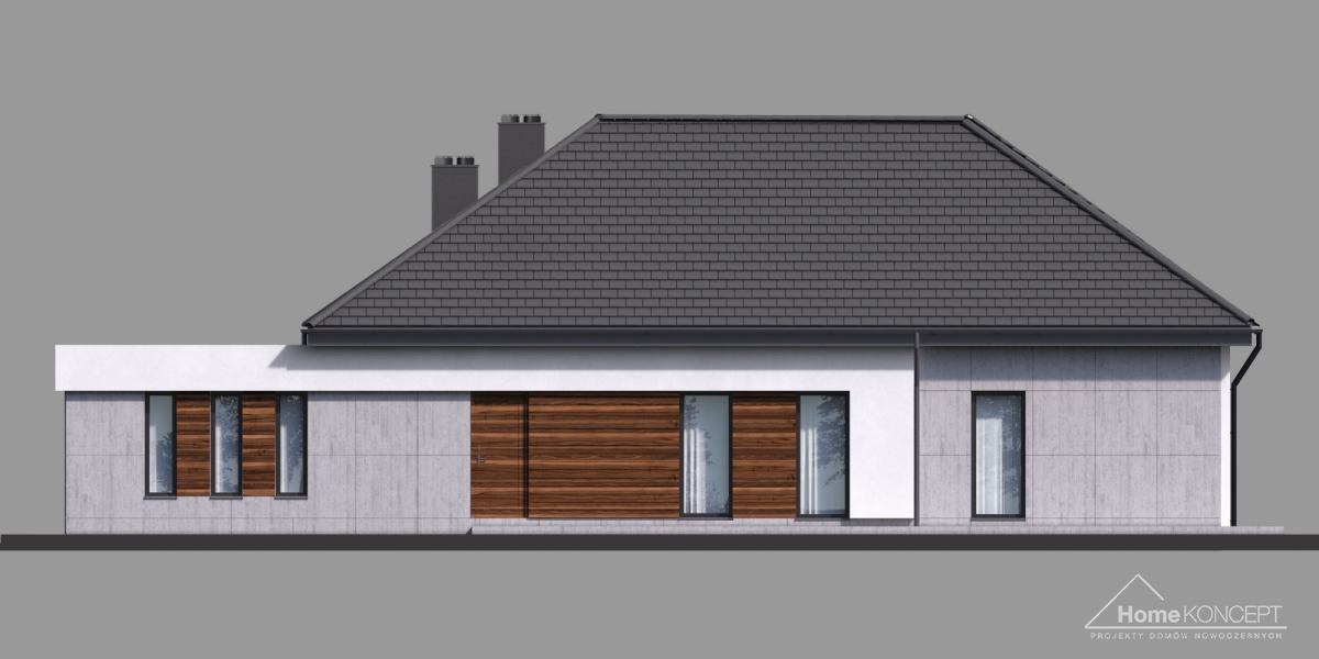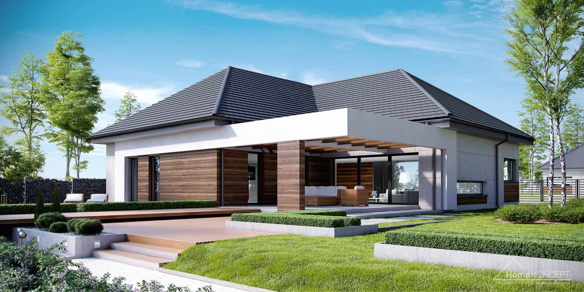 HomeKoncept 26 jest wyjątkowym domem parterowym. Uwagę przyciąga niezwykle ciekawy taras, elegancka elewacja domu wykonana z płyt betonowych połączonych z szlachetnym drewnem oraz białe belkowania wokół domu. Od frontu domu nie sposób nie zwrócić uwagi na reprezentacyjne wejście, delikatnie schowane pod drewnianym belkowaniem.