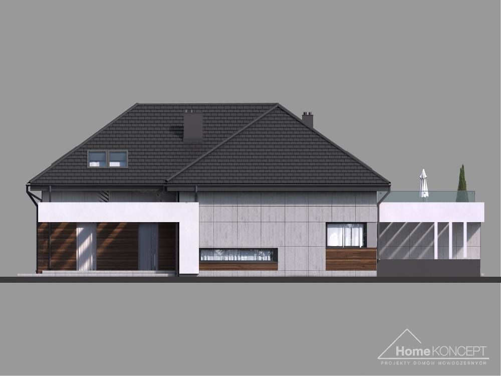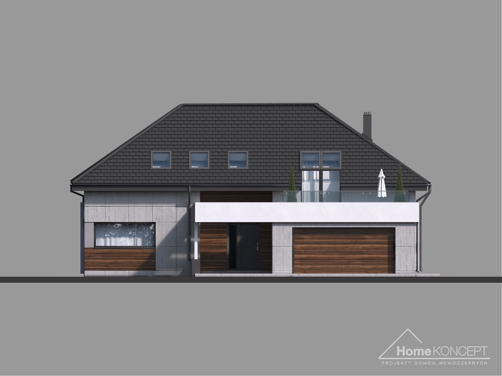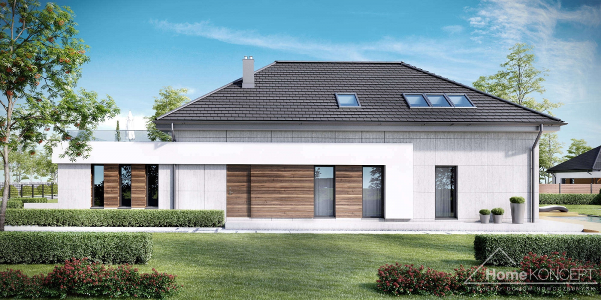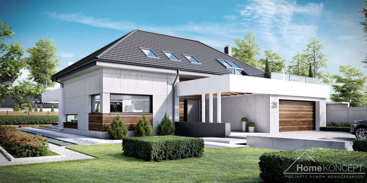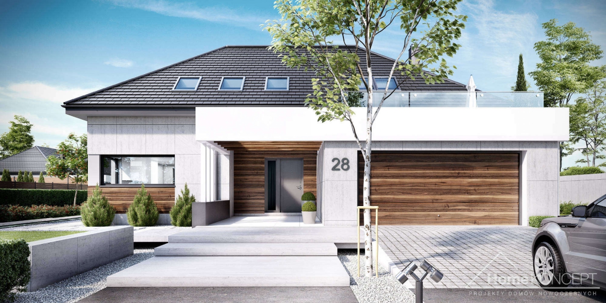 HomeKoncept 28 jest rozbudowaną wersją domu HomeKoncept 26, w którym zaadoptowano poddasze. Podobnie jak w pierwowzorze – uwagę przyciąga niezwykle ciekawy taras, elegancka elewacja domu wykonana z płyt betonowych połączonych z szlachetnym drewnem oraz białe belkowania wokół domu. Od frontu domu nie sposób nie zwrócić uwagi na reprezentacyjne wejście, delikatnie schowane pod drewnianym belkowaniem.