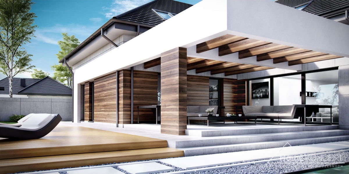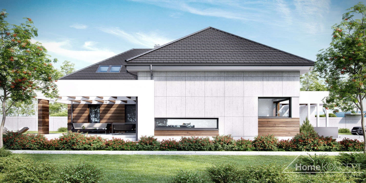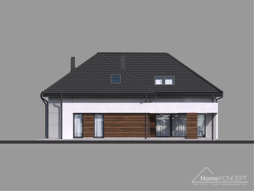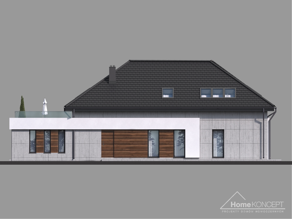 HomeKoncept 28 jest rozbudowaną wersją domu HomeKoncept 26, w którym zaadoptowano poddasze. Podobnie jak w pierwowzorze – uwagę przyciąga niezwykle ciekawy taras, elegancka elewacja domu wykonana z płyt betonowych połączonych z szlachetnym drewnem oraz białe belkowania wokół domu. Od frontu domu nie sposób nie zwrócić uwagi na reprezentacyjne wejście, delikatnie schowane pod drewnianym belkowaniem.
