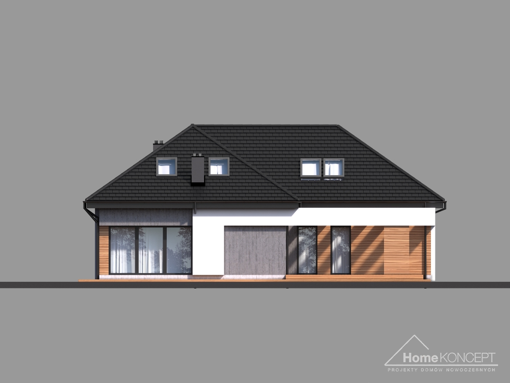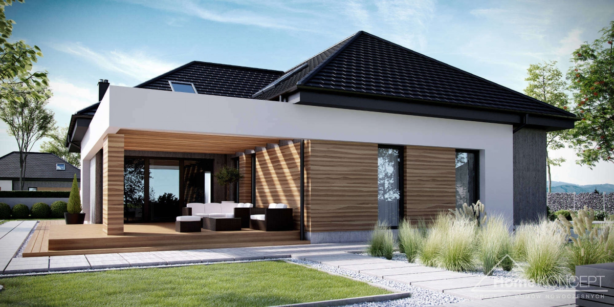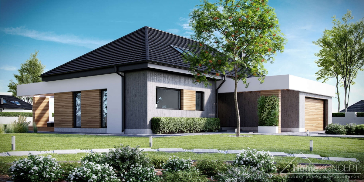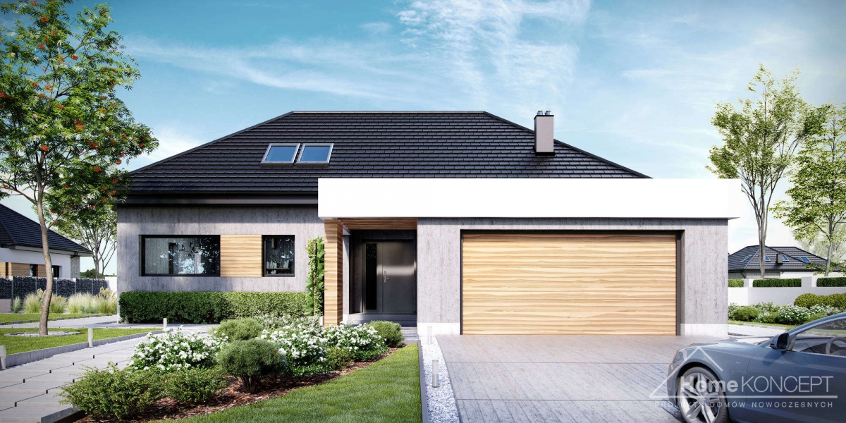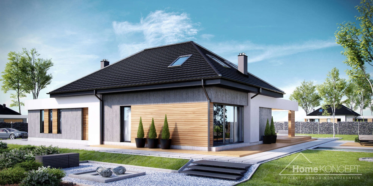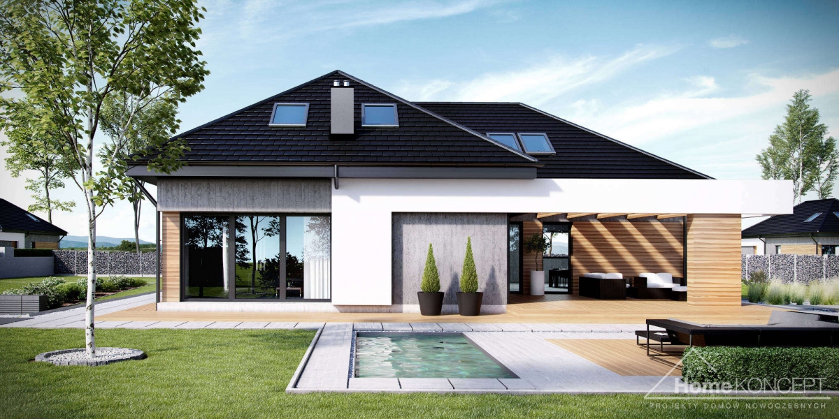 HomeKoncept 29 to wersja naszego bardzo popularnego projektu HomeKoncept 27 – z zaadaptowanym poddaszem. Wyjątkowy charakter domu podkreśla taras oraz wejście do domu – ozdobione atrakcyjnym i nowoczesnym belkowaniem.
