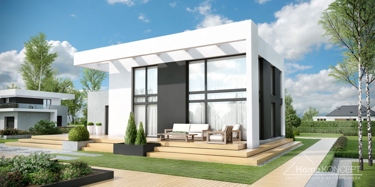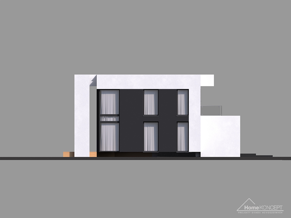 HomeKONCEPT-34 to mniejsza wersja naszego wyjątkowego domu HomeKONCEPT-30. Wyróżnia się on nowoczesnym, wyrazistym charakterem bryły podkreślonym unikatowym belkowaniem. Niecodzienny styl tego domu wyrażony jest prostą i czytelną bryłą oraz geometrycznym detalem. Modernistyczną formę podkreśla wykończenie elewacji skomponowane w tonacji bieli i szarości połączone z ciemną stolarką okienną.