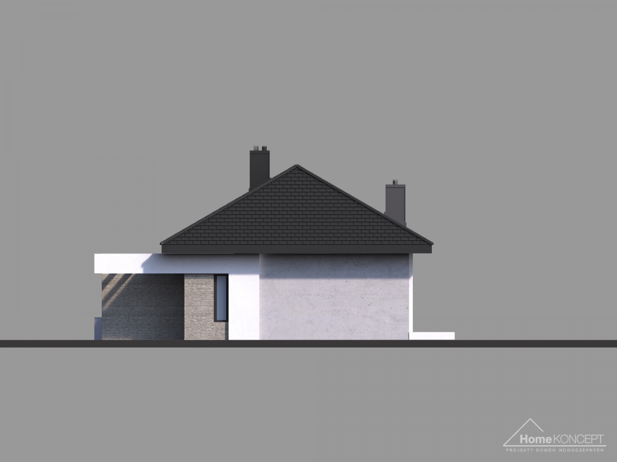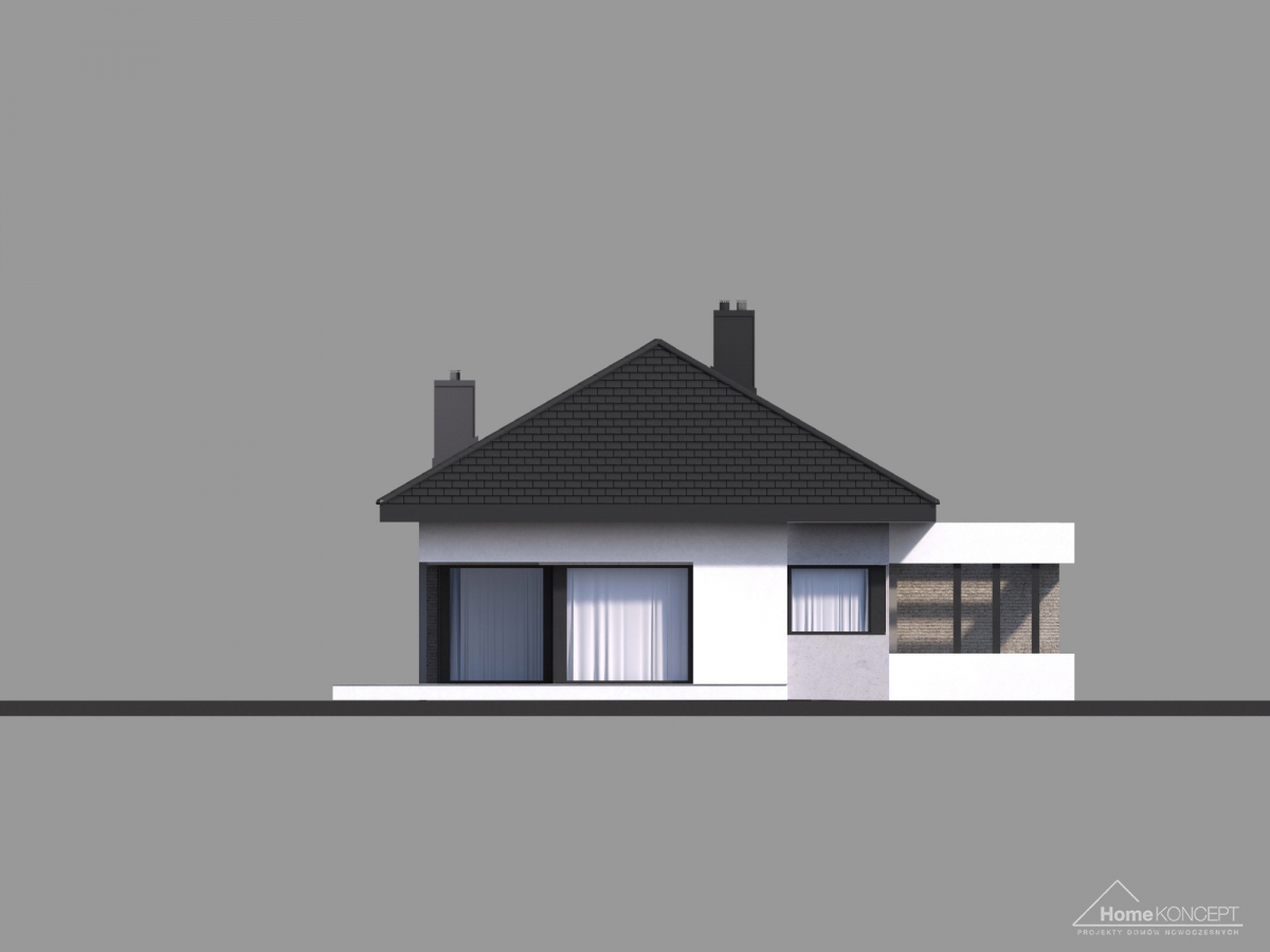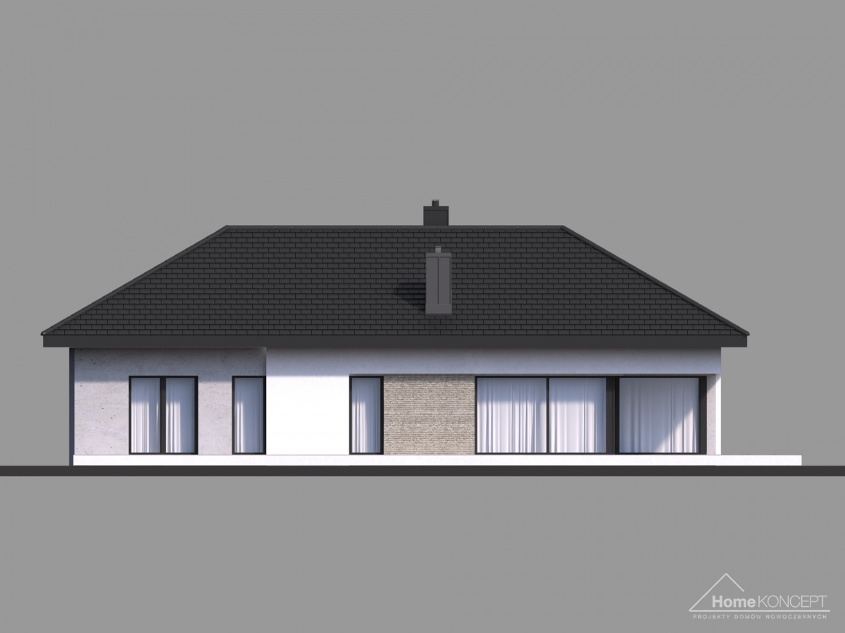 Projekt domu HomeKONCEPT-38 to niewielki, zwarty dom parterowy, będący doskonałą propozycją dla czteroosobowej rodziny. Od strony elewacji frontowej jego bryłę urozmaica wysunięty przed lico ściany dwustanowiskowy garaż oraz ozdobne, wsparte filarami belkowanie. Atrakcyjne wcięcie tarasu w bryłę od strony ogrodu przełamuje jej prostą formę i sprawia, że część salonowa jet nieco odseparowana od jadalni. Całą część dzienną oddzielają od ogrodu imponujące przeszklenia, które zapewnią odpowiednio doświetlone wnętrze oraz optycznie je powiększą.