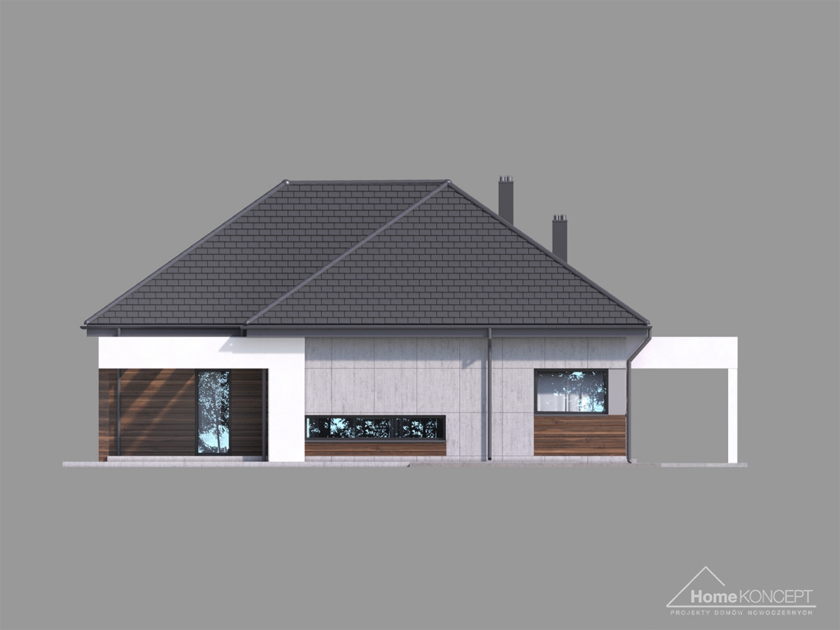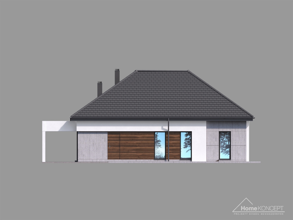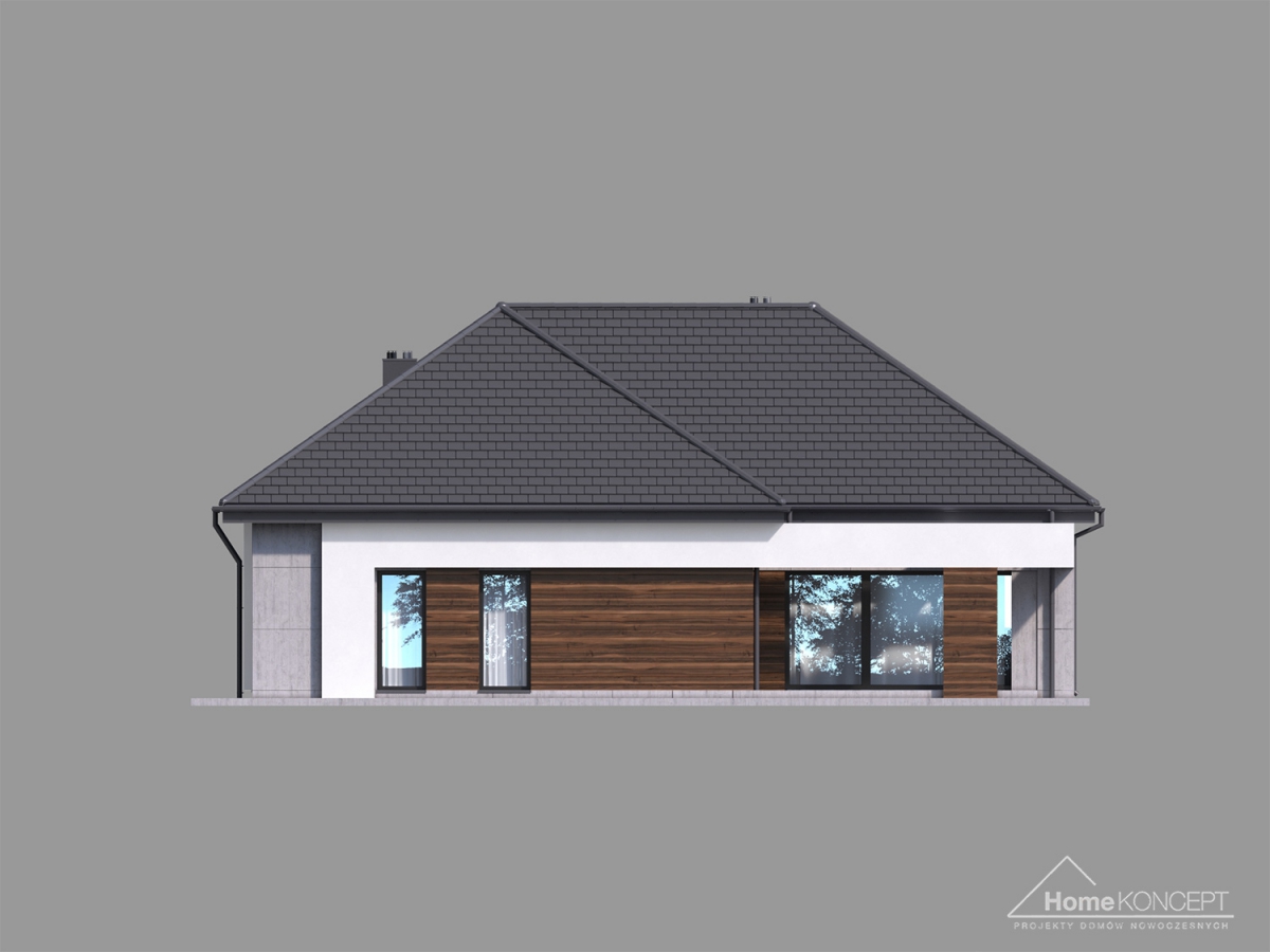 HomeKONCEPT-39 to wersja naszego popularnego domu HomeKONCEPT-31 w której usunięto garaż, a w jego miejscu zaprojektowano charakterystyczne belkowanie. W efekcie bryła od strony frontowej zyskała piękne wykończenie i miejsce na klimatyczną przestrzeń przed domem.