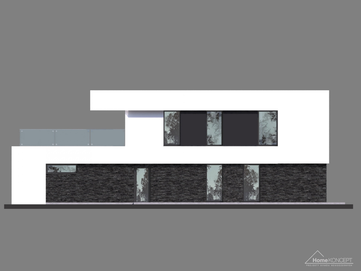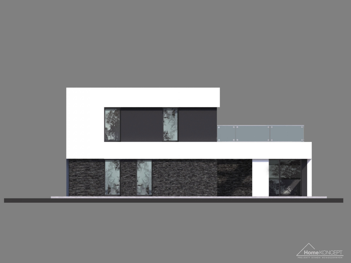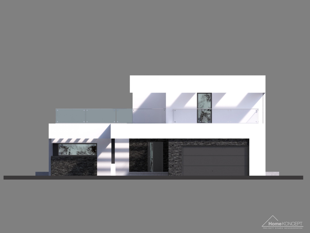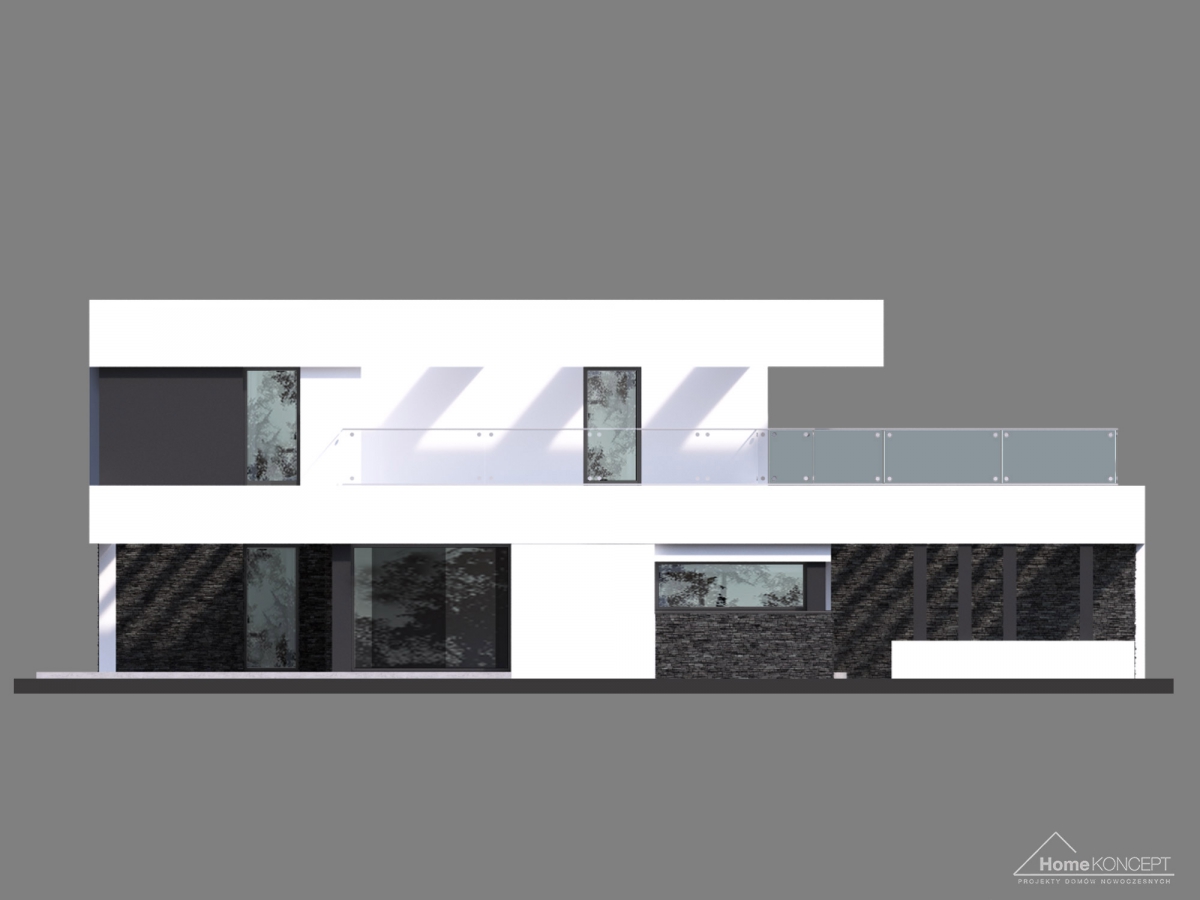 HomeKONCEPT-41 to dom piętrowy o interesującej stylistyce, wyjątkowych rozwiązaniach architektonicznych i ciekawym układzie funkcjonalnym. Wzrok przyciąga dwukolorowa elewacja, zaprojektowana z kamienia elewacyjnego połączonego z białym i czarnym tynkiem.