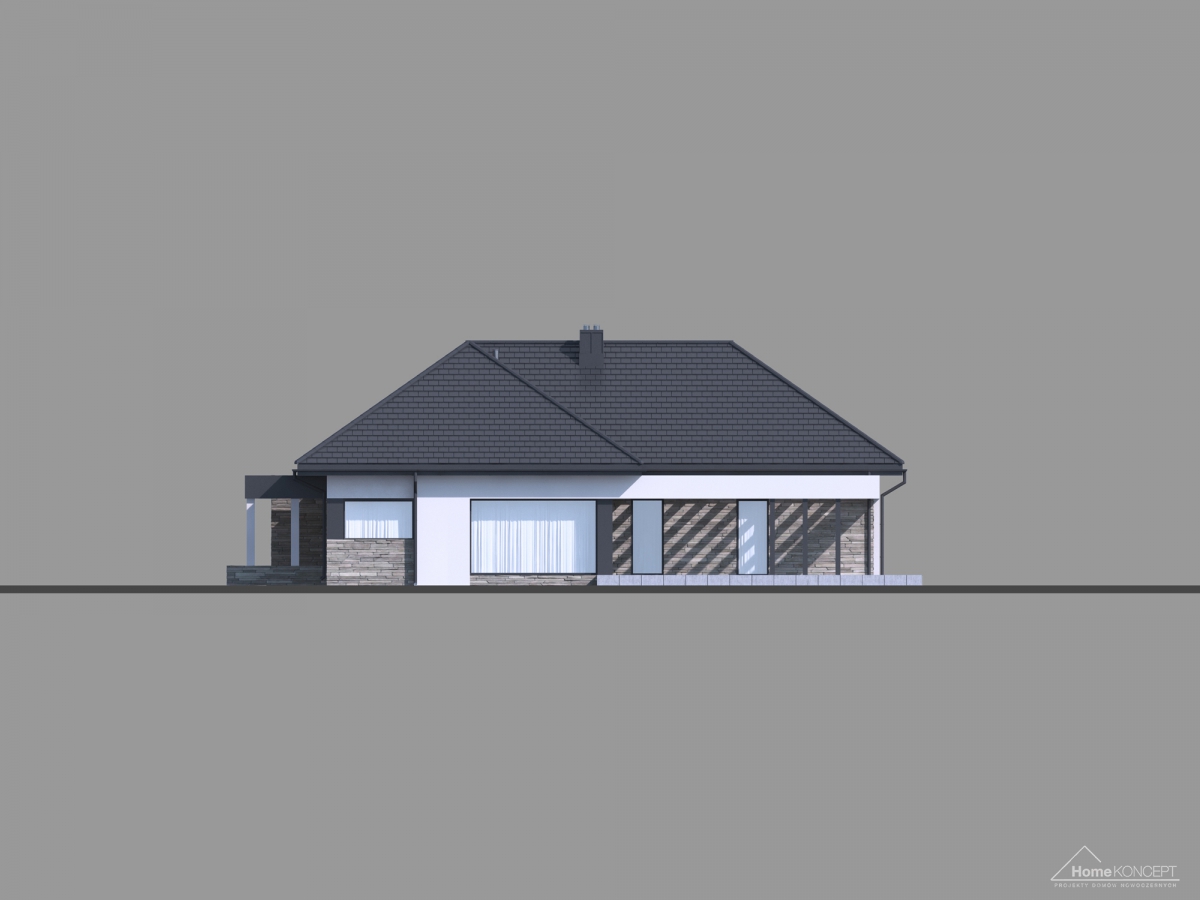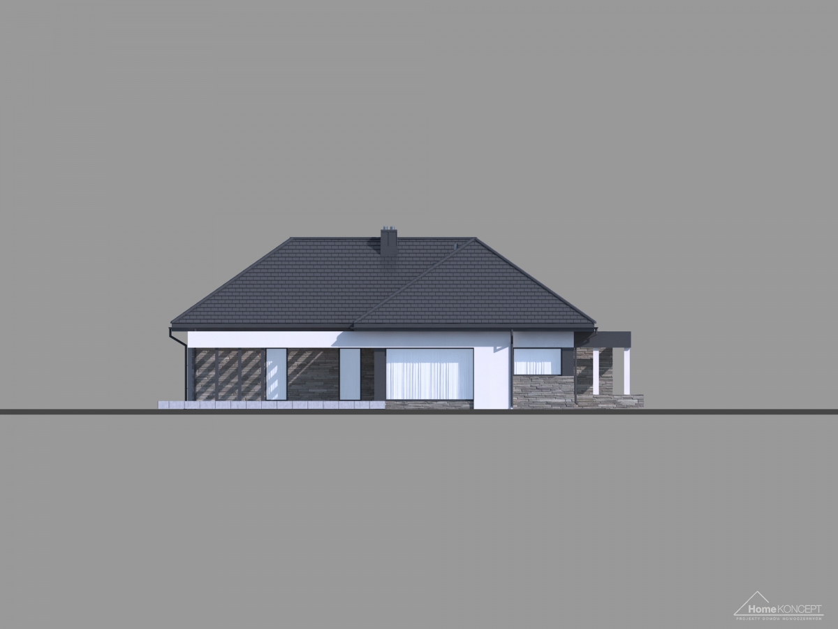 Projekt domu HomeKONCEPT 42 B to interesująca propozycja domu parterowego do zabudowy bliźniaczej z ciekawie zaaranżowaną, bardzo nowoczesną elewacją. Bryłę budynku podkreśla unikalne belkowanie ozdabiające strefę wejściową oraz osłaniające taras przed nadmiernym nasłonecznieniem. Stonowana kolorystyka elementów elewacji została skomponowana z naturalnego kamienia połączonego z tynkiem i antracytową dachówką. Bardzo duże przeszklenia doskonale doświetlają pomieszczenia i jednocześnie łączą dom z ogrodem.