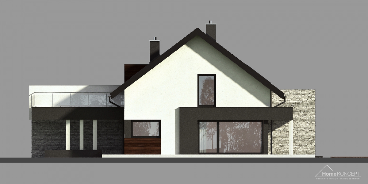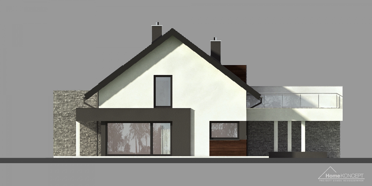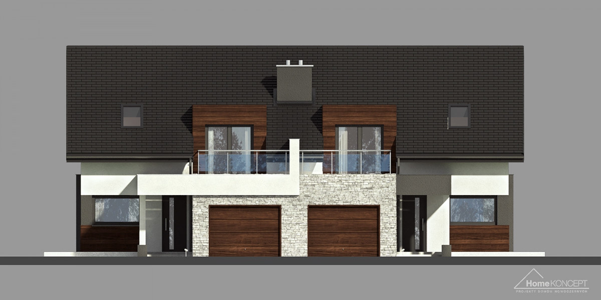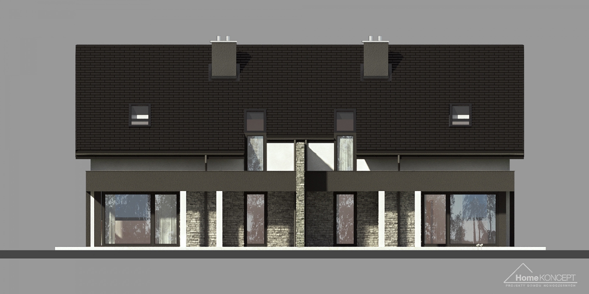 HomeKONCEPT 47 B to projekt domu przeznaczony do zabudowy bliźniaczej, wyróżniający się ciekawymi rozwiązaniami architektonicznymi. W strefie wejściowej zwraca uwagę charakterystyczne belkowanie, które zostało zaprojektowane w dwóch wariantach kolorystycznych, oddzielnie dla każdego segmentu. Nowoczesne wykończenie elewacji z okładzin kamiennych, naturalnego drewna oraz tynku w stonowanych barwach, podkreśla wyjątkową stylistykę budynku. Duże przeszklenia części dziennej bardzo dobrze doświetlają wnętrza, łącząc jednocześnie dom z otaczającym go ogrodem. Ozdobne belkowanie zastosowane nad tarasem to atrakcyjny detal architektoniczny wyróżniający całą kolekcję HomeKONCEPT.