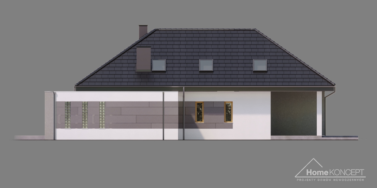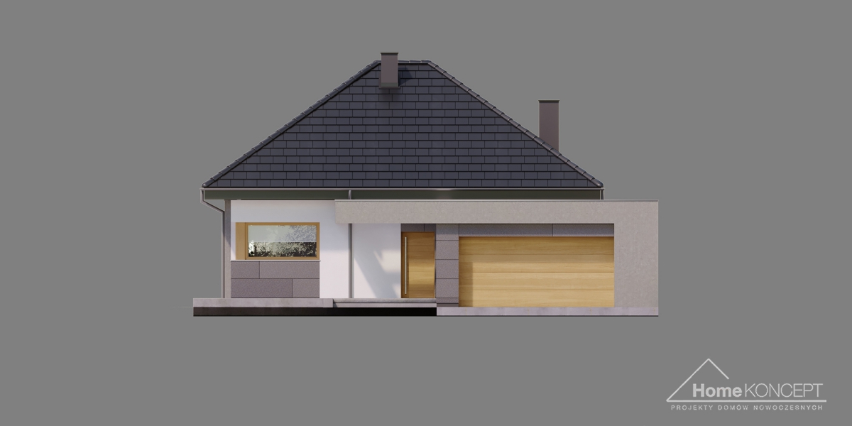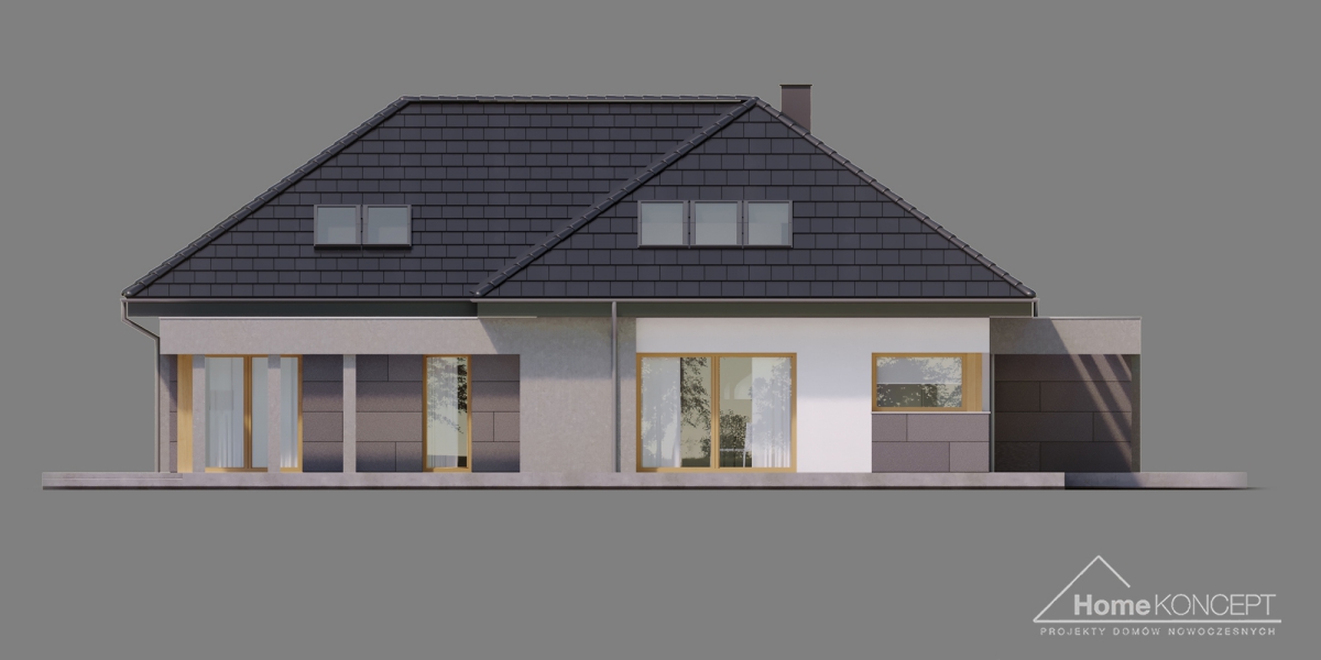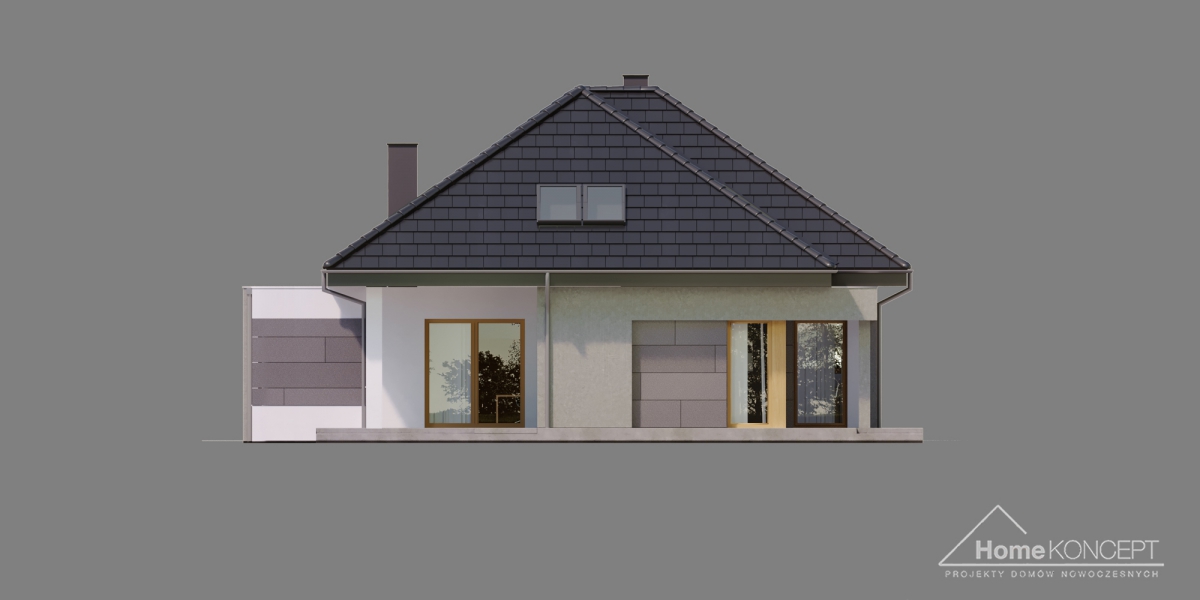 HomeKONCEPT 57 to bardzo komfortowy dom parterowy z poddaszem użytkowym, zaprojektowany w atrakcyjnej, nowoczesnej stylistyce. Piękna ponadczasowa elewacja została skomponowana z białego i szarego tynku oraz ozdobiona okładzinami z naturalnego kamienia. Płaska dachówka w kolorze antracytowym, doskonale komponuje się z całością, a jasno brązowa stolarka okienna i drzwiowa dodatkowo ociepla kolorystykę budynku. Ozdobne belkowanie, okalające zarówno strefę wejściową jak również taras wypoczynkowy, znajdujący się od ogrodu, to element wyróżniający naszą kolekcję projektową.
