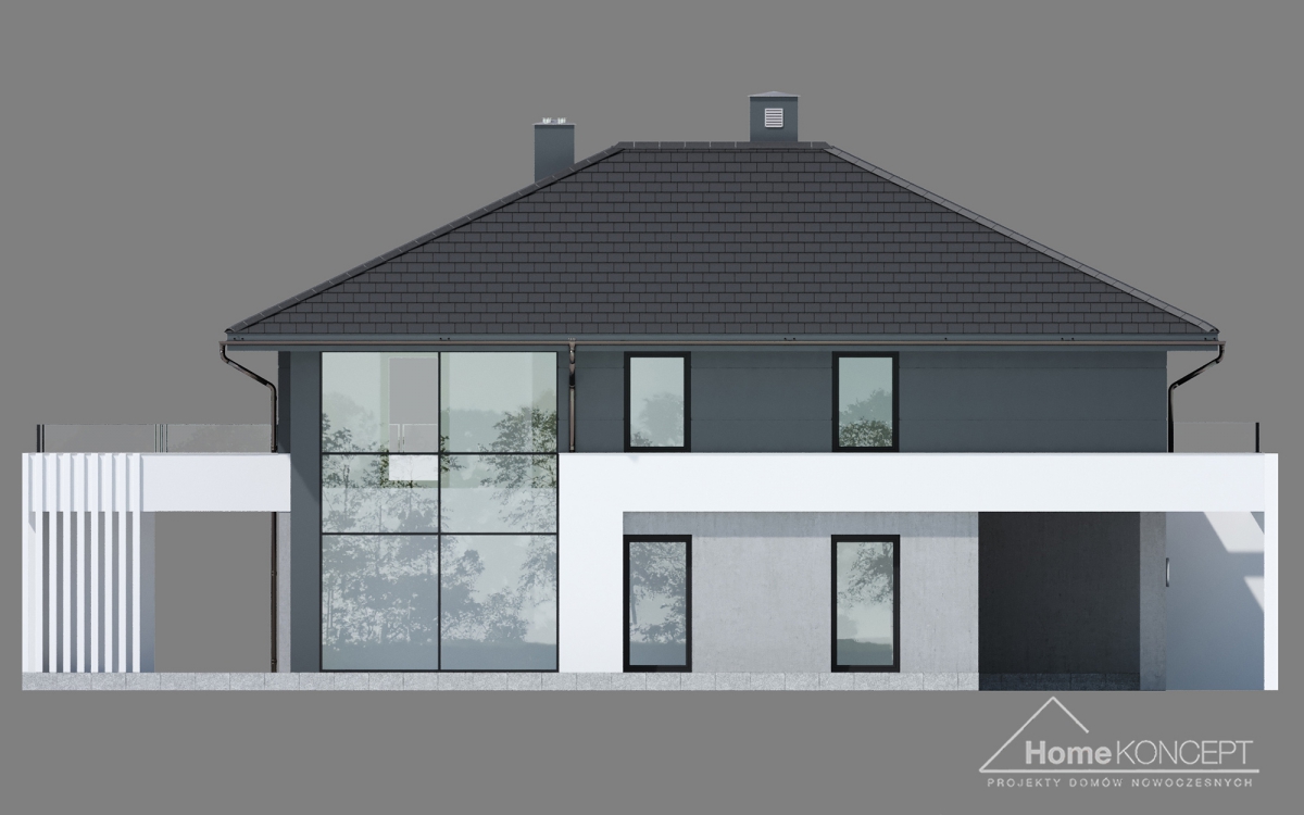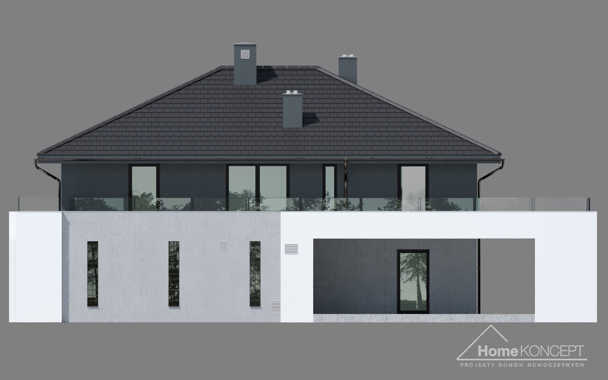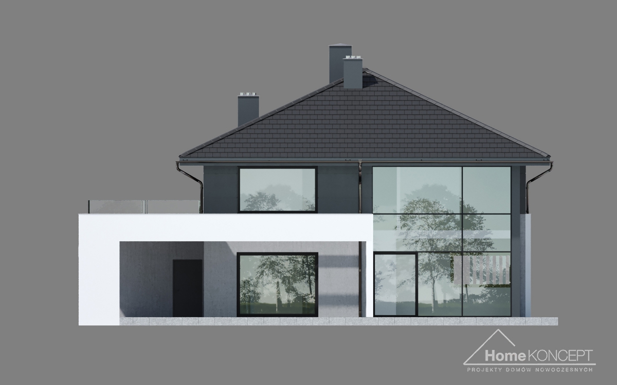HomeKONCEPT 60 to wyjątkowo elegancka i bardzo komfortowa willa zaprojektowana w stylu nowoczesnym. Łączy ona ponadczasowe rozwiązania architektoniczne z komfortowymi oraz atrakcyjnie zaplanowanymi wnętrzami. Budynek należy do kategorii domów piętrowych, dzięki czemu wszystkie pomieszczenia znajdujące się na górnej kondygnacji są pozbawione skosów i łatwe do urządzenia. Z zewnątrz HomeKONCEPT 60 zachwyca doskonale zaaranżowaną, ponadczasową elewacją. Została ona skomponowana z dwubarwnego tynku cienkowarstwowego i ozdobiona białym belkowaniem, biegnącym wokół budynku. Duże, dwukondygnacyjne przeszklenia dodatkowo uatrakcyjniają bryłę domu. Kolorystyka stolarki okiennej i drzwiowej oraz dopasowana do całości tonacja dachówki idealnie uzupełniają całą kompozycję. Od strony ogrodowej zachwyca piękny, częściowo zadaszony taras, na którym można zorganizować rodzinne przyjęcie nie tylko w czasie pięknej pogody, ale również w deszczowej aurze.