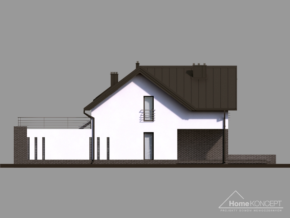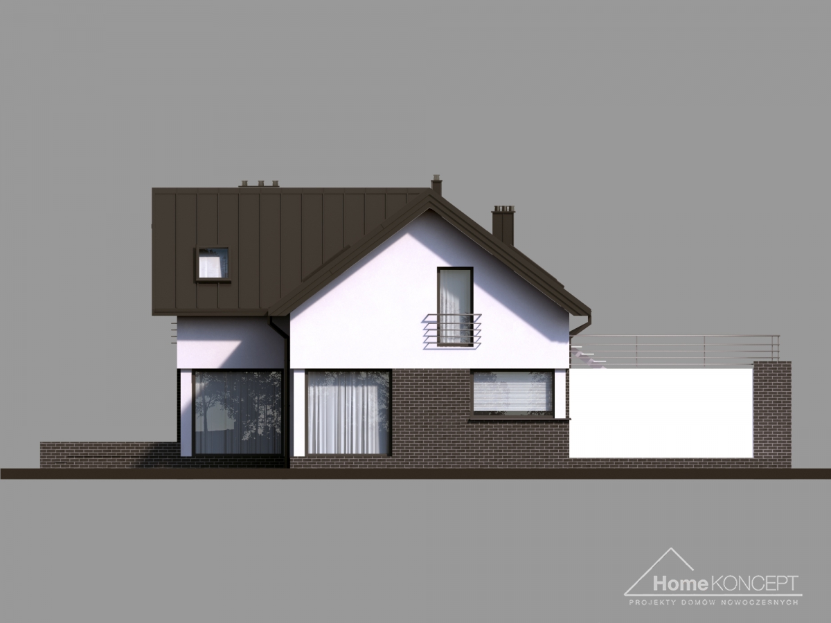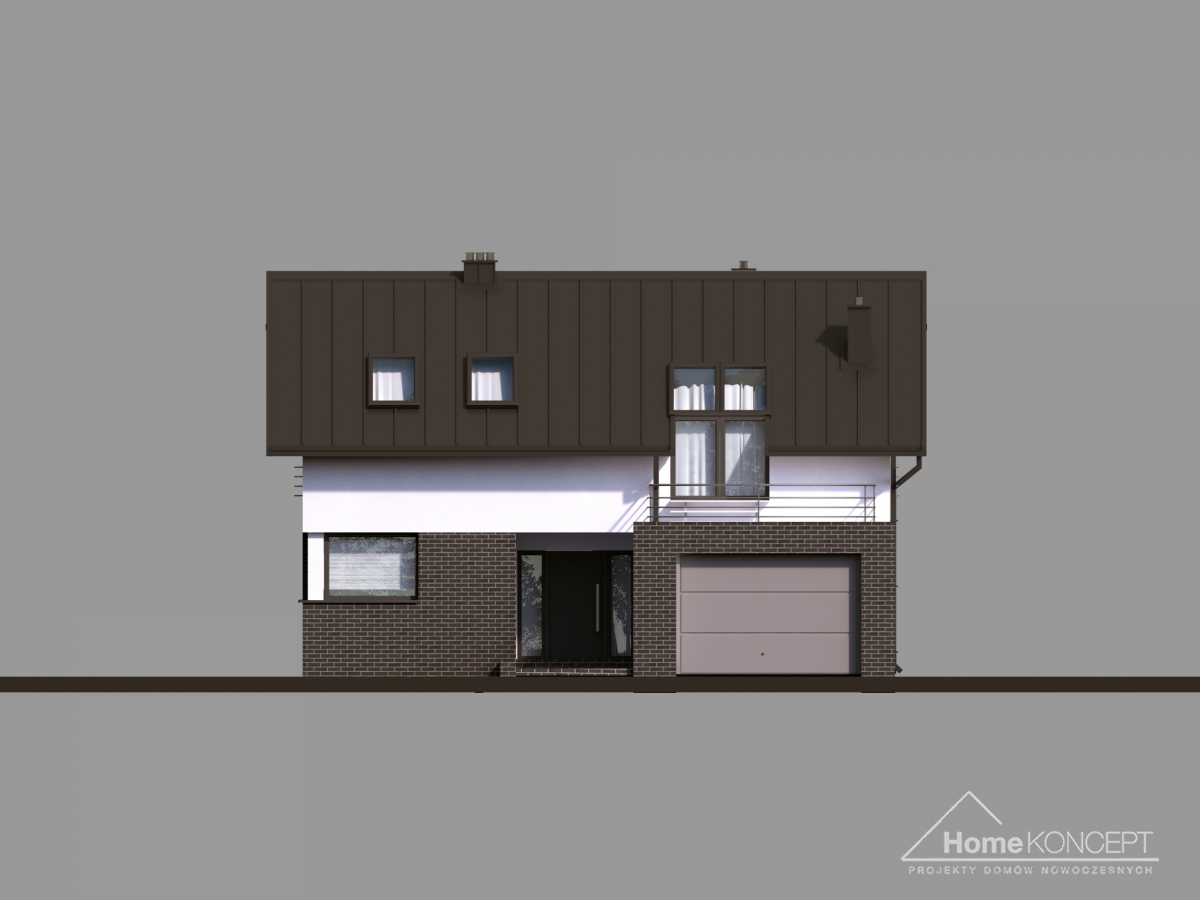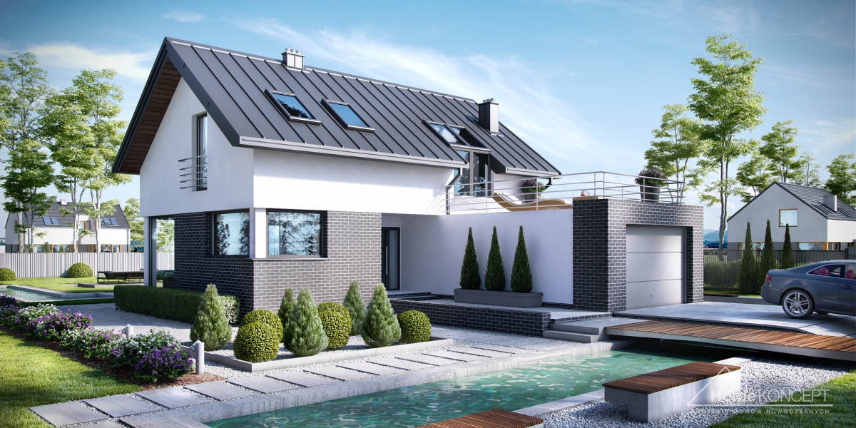 HomeKONCEPT-09 to propozycja nowoczesnego, niewielkiego domu o niezwykle komfortowym układzie pomieszczeń. Jego klasyczna forma została uwspółcześniona poprzez zastosowanie dużych przeszkleń oraz wyrazistych materiałów elewacyjnych. Pełną światła, otwartą część dzienną tworzy kuchnia z jadalnią oraz nieco oddalony salon. Na parterze znajdziemy również dużą, wygodną garderobę oraz łazienkę. Jednostanowiskowy garaż wysunięty przed dom przełamuje prostą bryłę budynku. Powierzchnię dachu garażu wykorzystano pod duży taras.