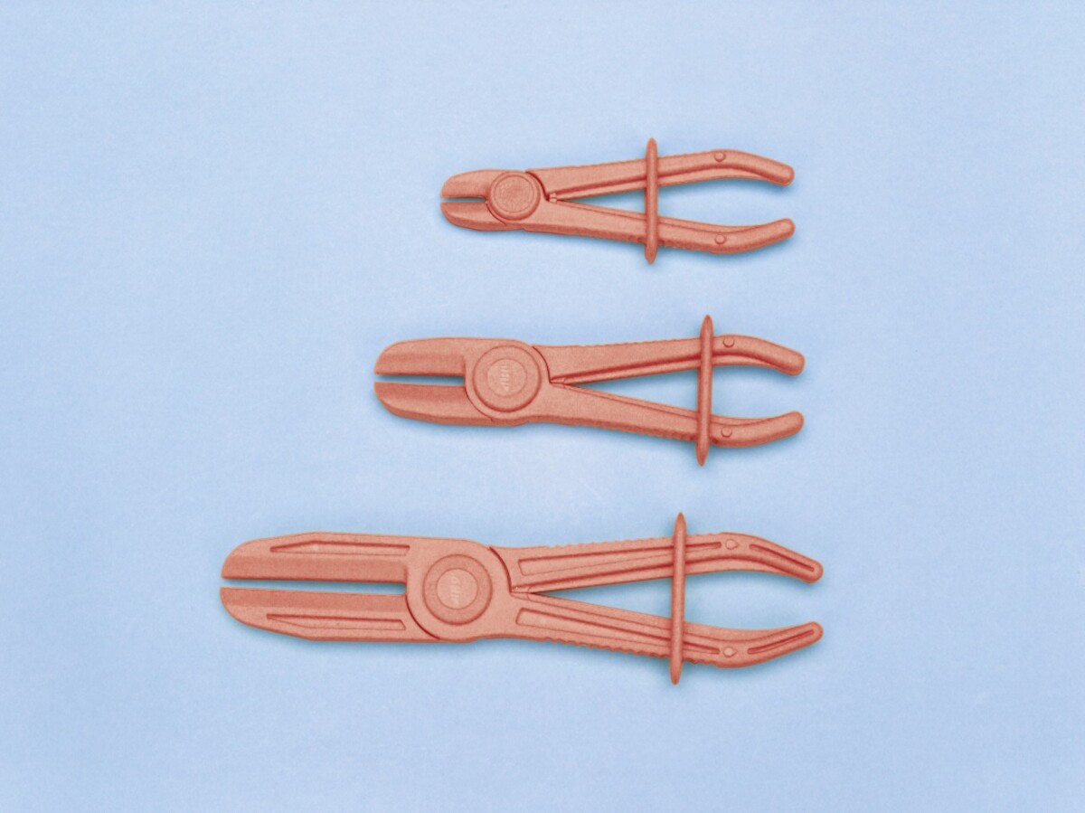 Kolejnym praktycznym narzędziem jest zestaw szczypiec do odłączania przewodów, elastycznych, wodnych, paliwowych oraz olejowych. Mechanizm blokujący utrzymuje szczypce w danym położeniu, a zaokrąglone szczęki minimalizują ryzyko uszkodzenia przewodów. Wzmocniona włóknem szklanym konstrukcja zapewnia trwałość i widoczność w miejscu pracy.