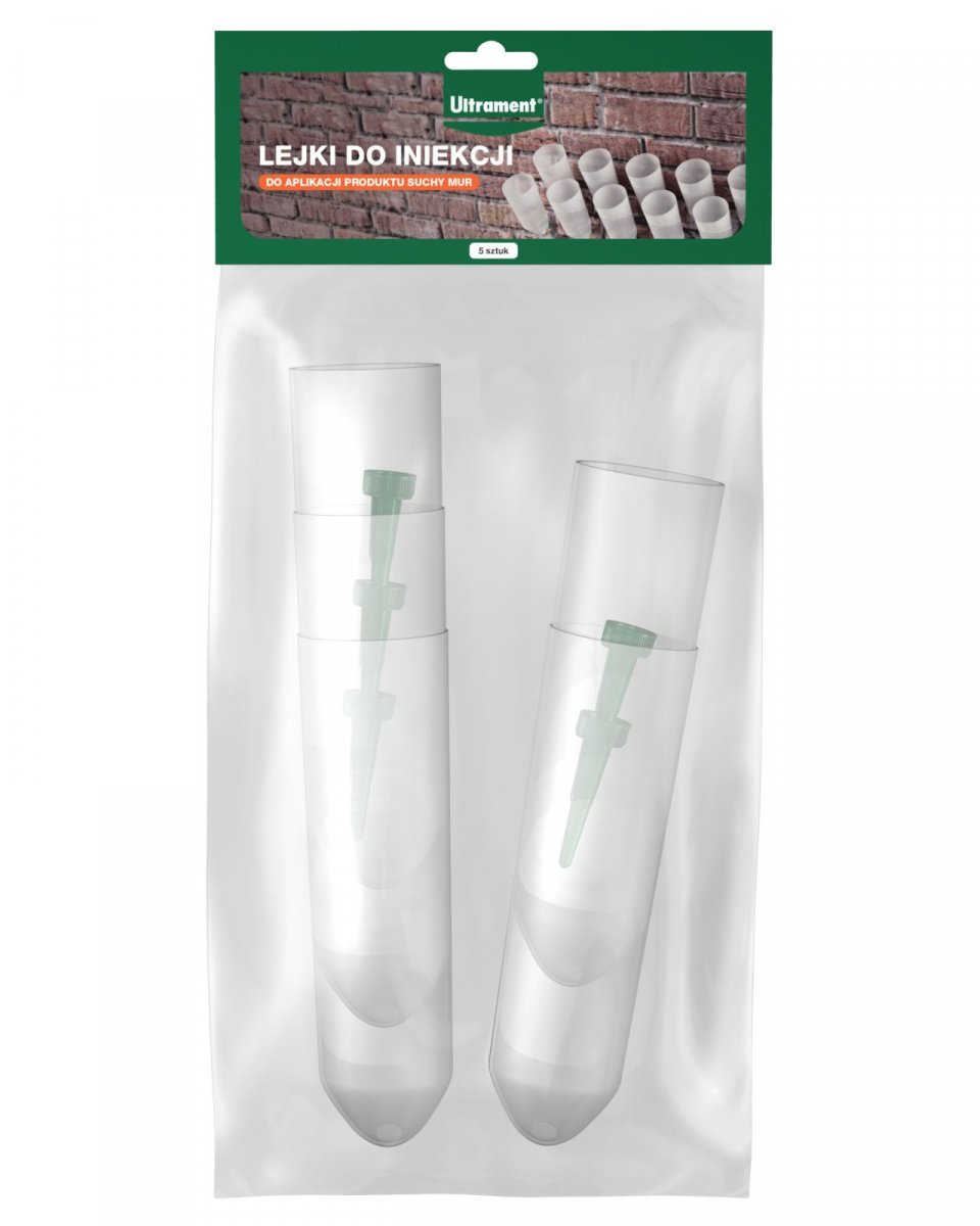 Lejki do iniekcji od Ultrament to produkt stosowany do aplikacji preparatu Suchy Mur. Odpowiednio wyprofilowane końcówki umożliwiają optymalne dotarcie i rozprowadzenie płynu iniekcyjnego wewnątrz ścian i murów.