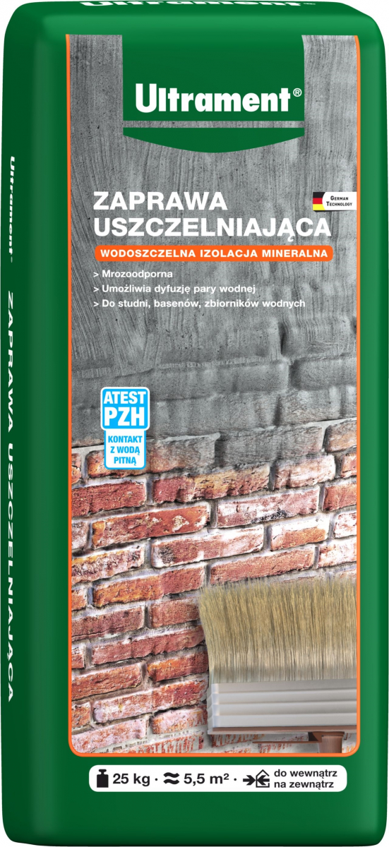 Zaprawa Uszczelniająca od Ultrament to produkt przeznaczony do wykonania przeciwwodnego i przeciwwilgociowego uszczelnienia wszystkich spotykanych w budownictwie nieodkształcalnych podłoży mineralnych. Dzięki swoim właściwościom i odporności na pozytywne ciśnienie wody (do 1,5 bar) skutecznie chroni konstrukcje murowe, betonowe, żelbetowe, ściany budynków i piwnic przed wilgocią z grunt oraz wodą gruntową, opadową.